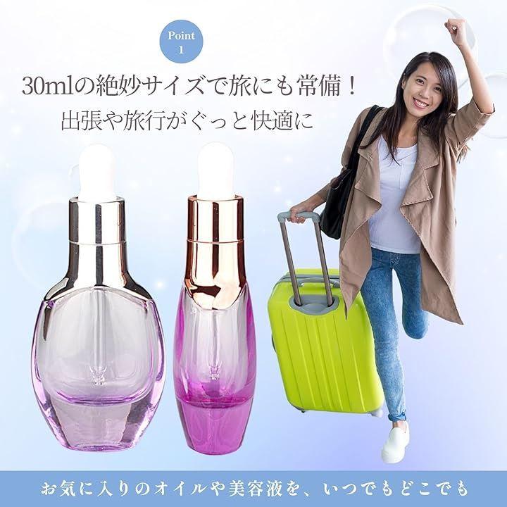 旅行や出張に便利な30mlサイズ:アロマオイルや化粧水、乳液を小分けにできる30mlのスポイトポンプ付きボトルは、旅行や出張のお供に最適。