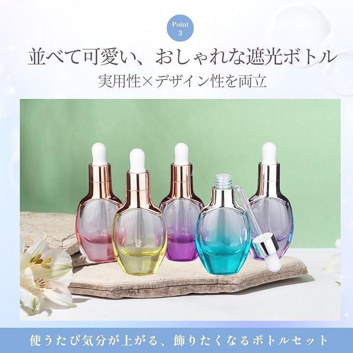スポイト付きで量の調整が簡単なスポイトボトル:スポイト付きなので、アロマオイルや美容液の使用量を正確に調整可能。