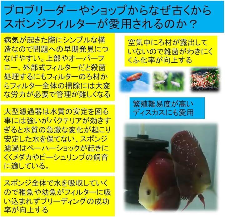 (3)スポンジ全体で水を吸収していくので稚魚や幼魚がフィルターに吸い込まれずブリーディングの成功率が向上する(4)空気中にろ材が露出していないので雑菌がわきにくくふ化率が向上する