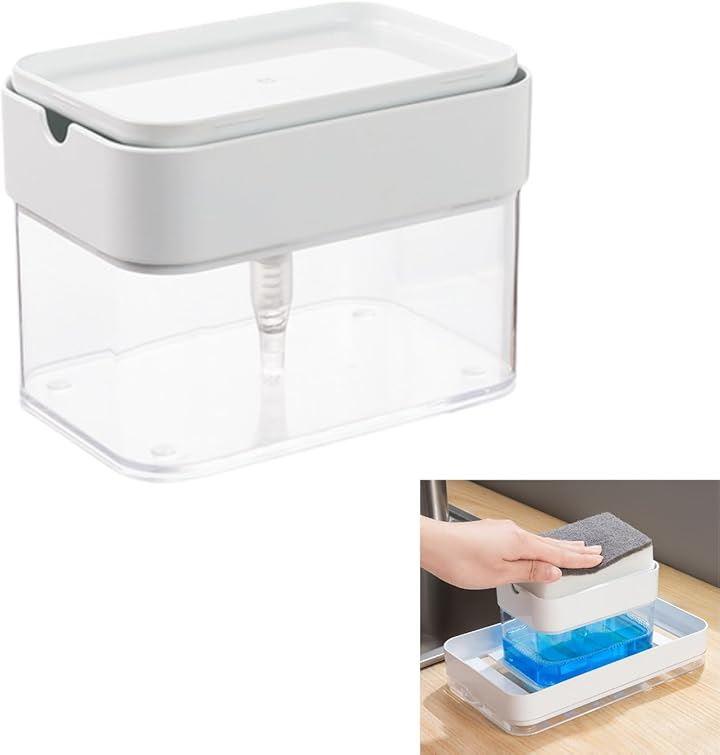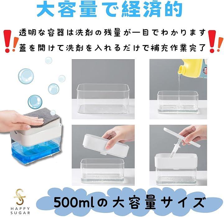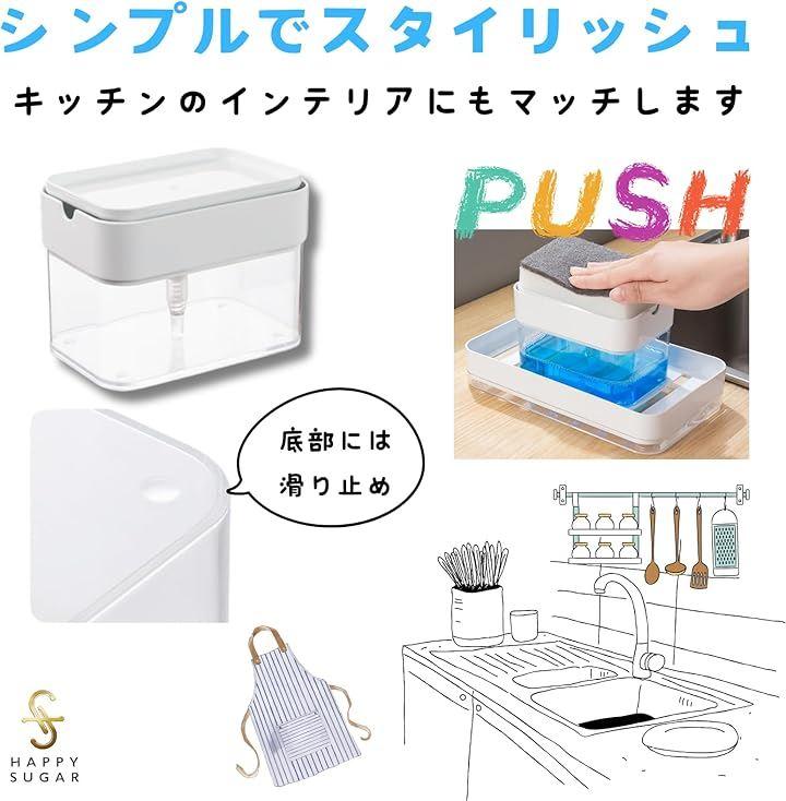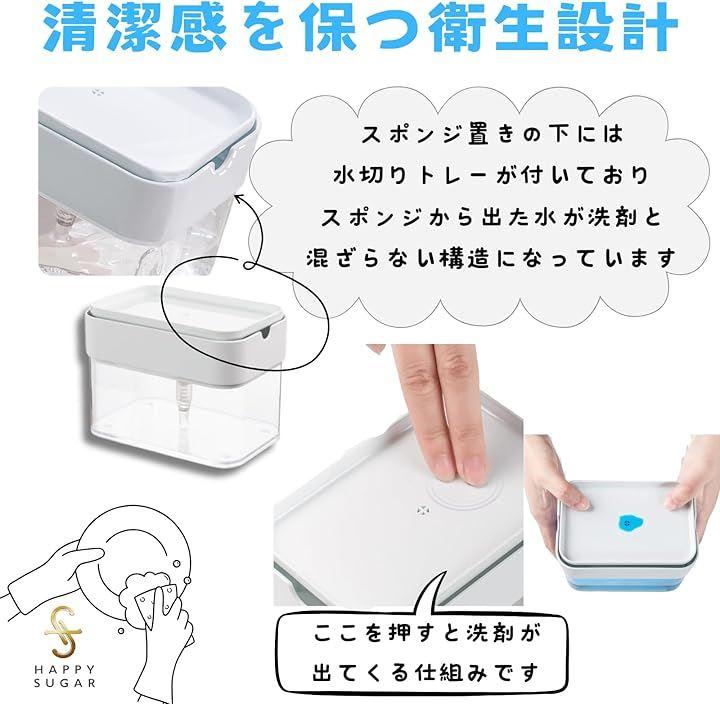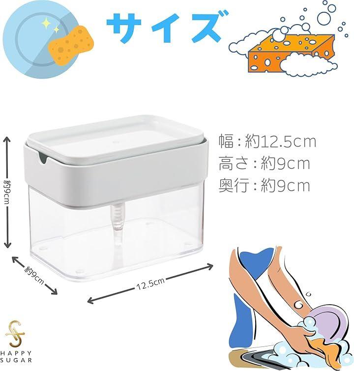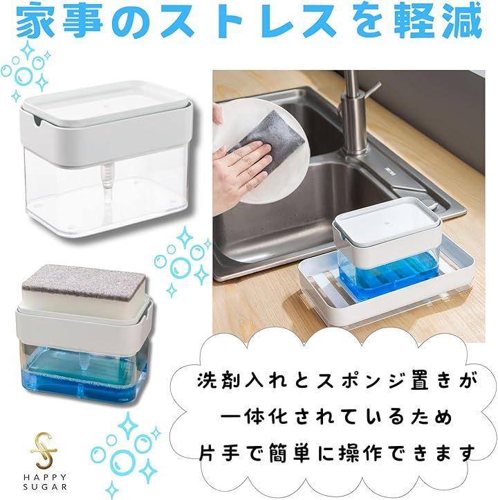 「家事のストレスを軽減。」洗剤入れとスポンジ置きが一体化されているため、片手で簡単に操作でき、効率的に家事を行うことができます。
