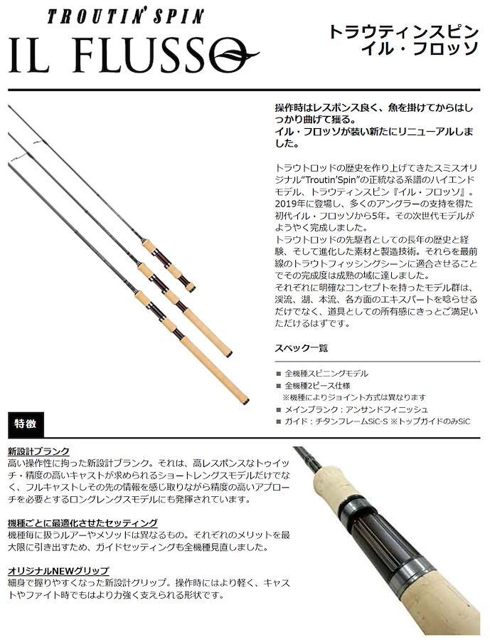 トラウトロッドの歴史を作り上げてきたスミスオリジナル“Troutin’Spin”の正統なる系譜のハイエンドモデル、トラウティンスピン『イル・フロッソ』。2019年に登場し、多くのアングラーの支持を得た初代イル・フロッソから5年。その次世代モデルがようやく完成しました。トラウトロッドの先駆者としての長年の歴史と経験、そして進化した素材と製造技術。それらを最前線のトラウトフィッシングシーンに適合させることでその完成度は成熟の域に達しました。それぞれに明確なコンセプトを持ったモデル群は、渓流、湖、本流、各方面のエキスパートを唸らせるだけでなく、道具としての所有感にきっとご満足いただけるはずです。