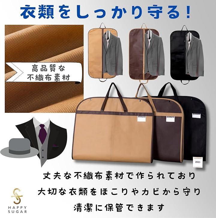「スーツや衣類をしっかり守る。」このスーツカバーは丈夫な不織布素材で作られており、大切な衣類をほこりやカビから守り、清潔に保管できます。
