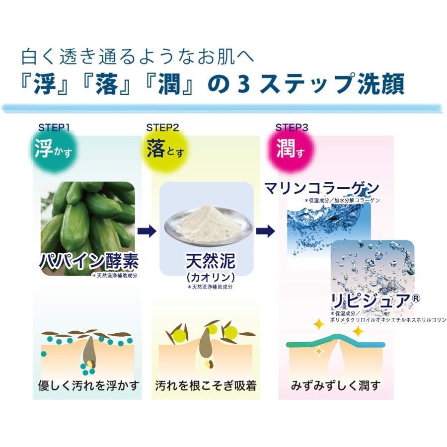 カサつくお肌に潤い泡のヴェール。●※低温で角質に浸透しやすいコラーゲン(※1)。・北海道 井原水産直送マリンコラーゲン※1配合。人の肌にも含まれるコラーゲンは、潤いやハリをサポートしています。コラーゲンの中でも、肌なじみのよい特性を持つ北海道 井原水産直送のマリンコラーゲンを配合しました。潤い泡のヴェールが、お肌を包みこみ潤いをキープしながら弾むような素肌へと洗い上げます。●くすみ(古い角質汚れ)をすっきりOFF。天然泥※2とパパインのW洗浄補助成分が、毛穴につまった古い角質・皮脂汚れをやさしく落とします。●メレンゲのような、ふわふわ泡・泡立てネット。泡のキメ細やかさと泡弾力を独自に検証・実験とモニターを重ね選定したオリジナルネット付き。ふわふわな泡で、洗顔時の摩擦からお肌を守り、ごわつく肌をなめらかに整えます。(泡立てネットで直接お肌をこすらないようにしてください。)※豚由来のコラーゲンと比べ、低温で角質に浸透しやすいマリンコラーゲン。※1 保湿成分/加水分解コラーゲン。