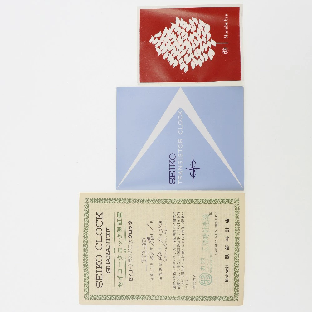 長期保管、未使用品。電池を入れて、今は時間も正常に動作していますが50年以上前に購入されたものですので、保証は出来かねます。付属の乾電池も古いためご使用は出来ません。某会社の竣工の記念品で、時計の裏に「新社屋竣工記念 株式会社〇〇」と記載がございます。ご理解の上ご購入をお願い致します。