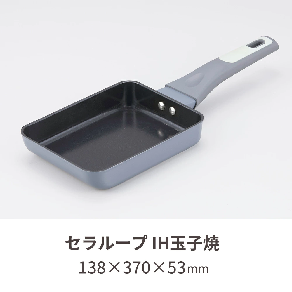 【商品名(JAN)】セラループ IH玉子焼(4904676014360)【商品サイズ(約)】セラループ IH玉子焼:138×370×53mm※いずれも底面厚:約2.9mm【重さ(約)】セラループ IH玉子焼:460g【材質】本体:アルミニウム合金底部:ステンレス鋼内面塗装:セラミック塗膜加工外面塗装:耐熱塗装加工ハンドル:フェノール樹脂(シリコーンゴム被膜)耐熱温度:140度【製造国】中国【商品情報】ガス火・IH使用OKセラミックコートの遠赤外線により、弱火でもしっかり調理出来ます。200VのIHはもちろん、あらゆる熱源で使えます。フッ素樹脂を使用していません。