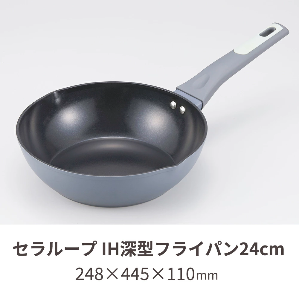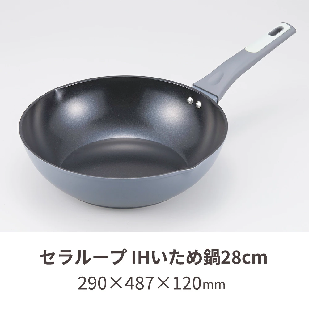 【商品名(JAN)】セラループ IHいため鍋28cm(4904676014407)【商品サイズ(約)】セラループ IHいため鍋28cm:290×487×120mm※いずれも底面厚:約2.9mm【重さ(約)】セラループ IHいため鍋28cm:950g【材質】本体:アルミニウム合金底部:ステンレス鋼内面塗装:セラミック塗膜加工外面塗装:耐熱塗装加工ハンドル:フェノール樹脂(シリコーンゴム被膜)耐熱温度:140度【製造国】中国【商品情報】ガス火・IH使用OKセラミックコートの遠赤外線により、弱火でもしっかり調理出来ます。200VのIHはもちろん、あらゆる熱源で使えます。フッ素樹脂を使用していません。