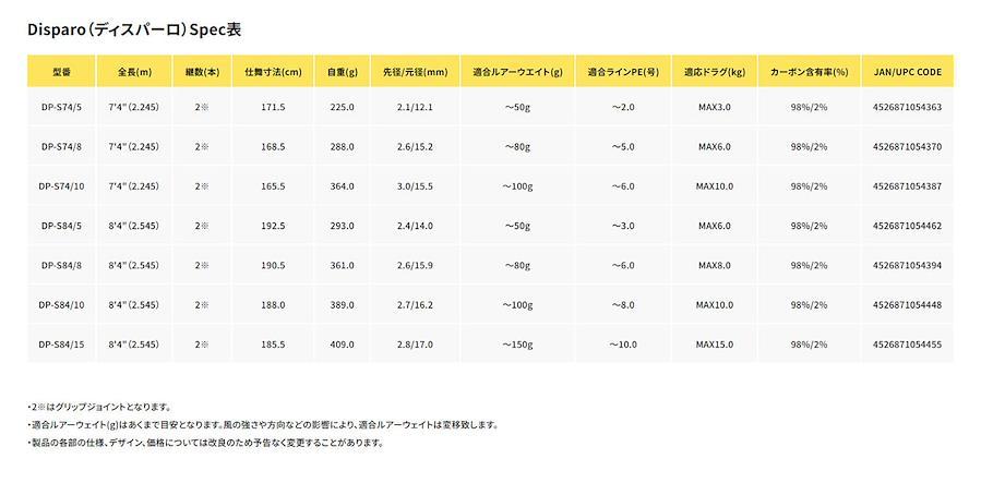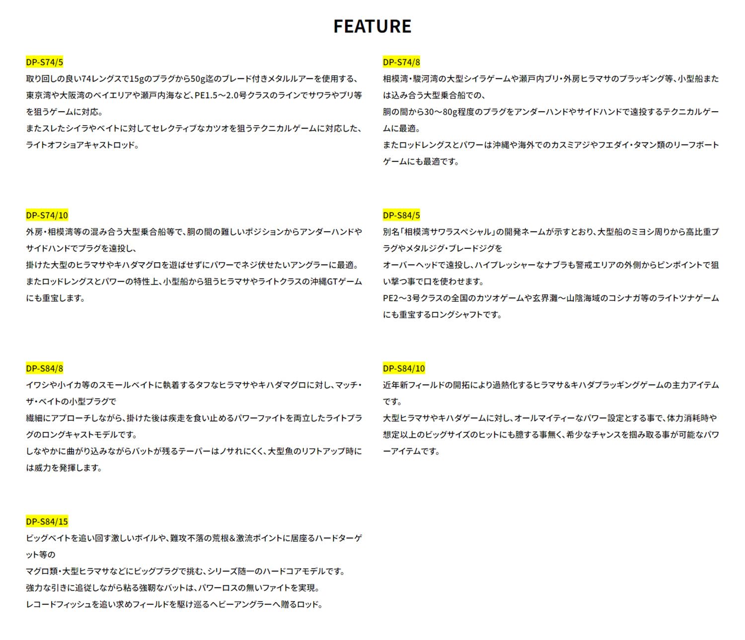 全長: 2.55m (8.4ft) / 継数: 2本 (グリップジョイント) / 仕舞寸法: 約1.86m / 自重: 409 g適合ルアーウエイト: ~150g / 適合PEライン: ~10.0号適合ドラグ: MAX 15.0kg / カーボン含有率: 98% (Dual Cross Xラッピング) / スピニングリール対応 / バット側ガイドセッティング一部逆付けありおすすめ対象魚: サワラ, カツオ , ブリ , シイラ , ブリ , ヒラマサ , マグロなど / おすすめ地域: 全国各地【DP-S84/15】……ビッグベイトを追い回す激しいボイルや、難攻不落の荒根&激流ポイントに居座るハードターゲット等のマグロ類・大型ヒラマサなどにビッグプラグで挑む、レコードフィッシュを追い求めるシリーズ随一のハードコアモデル。