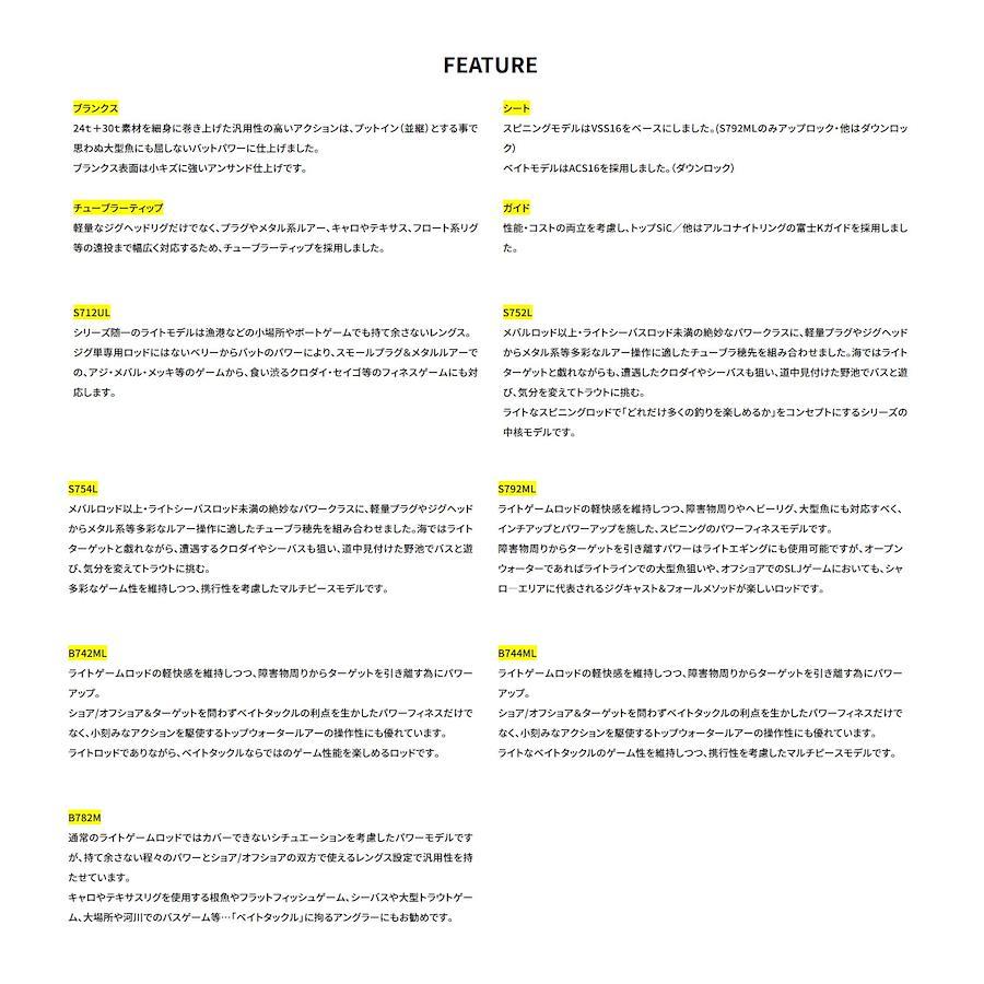 魚種・釣法毎に細分化された「専用」ロッドが並ぶ現代において、あえて専用化・細分化を避け、身近なフィールドとターゲットに対して汎用性の高い7ft台のレングスとパワーに設定しました。1本あれば淡水域から、ベイエリアや漁港、ボートゲームまで幅広くライトゲームに対応。手頃なサイズを相手に竿を曲げて楽しみながら、思わぬ大型魚とのファイトにも対応できるキャスティングロッドです。スピニングモデルはUL・L・MLのセンターカット2Pcモデルを3機種と、汎用性の広いLにモバイル4Pcを1機種ラインナップしました。