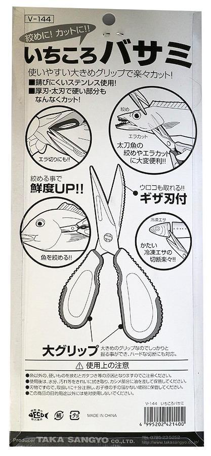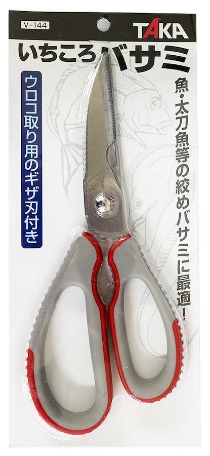 魚・太刀魚等の絞めバサミに最適! ウロコ取り用のギザ刃付き。使いやすい大き目のグリップで楽々カット! ●錆びにくいステンレス使用! ●厚刃・太刃で硬い部分もなんなくカット! ●大きめのグリップなのでしっかりと握ることができ、ハードな切断にも対応。