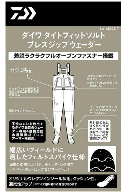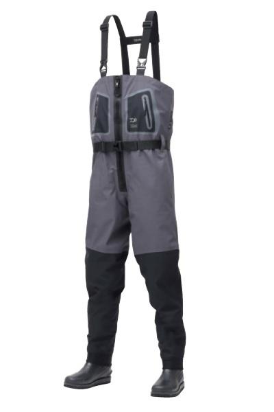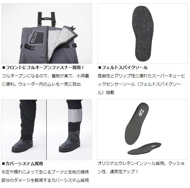 ダイワ初のフロントフルオープンファスナーを採用!!フルオープンになるので、着脱が楽。ウェーダー内のムレも一気に放出。タイトフィットモデルでありながら、立体裁断で歩行性が向上。不快なムレを低減するダイワ独自のウェーダー専用4層構造防水透湿素材「ブレスアーマー」採用。ブーツと生地の接続部分はダメージを軽減するカバーシステム採用。オリジナルウレタンインソール採用。クッション性、通気性アップ。屈曲性とグリップ性に優れたスーパーキュービックセンサーソール(フェルトスパイクソール)搭載。屈曲性が高く軽量で紫外線劣化に強いPVC一体成型ブーツ。ショート丈で高い機動性能。ファスナー付きポケット搭載(ポケットは防水仕様ではありません) カラー:ブラック タイプ:チェストハイ型・先丸 サイズ:3L 足サイズ:27.0-28.0cm ソールタイプ:フェルトスパイクソール(キュービックセンサーソール) ※実物と色が違って見える場合があります。あらかじめご了承下さい。