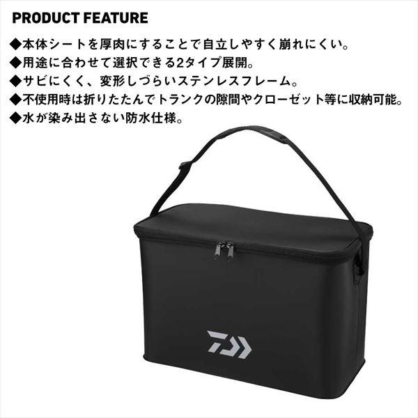 自立しやすい厚肉ボディの大型トート。本体シートを厚肉にすることで自立しやすく崩れにくい。用途に合わせて選択できる2タイプ展開。サビにくく、変形しづらいステンレスフレーム。不使用時は折りたたんでトランクの隙間やクローゼット等に収納可能。水が染み出さない防水仕様。 外寸(縦×横×高さ):約27×55×35cm カラー:ブラック 素材:EVA ※実物と色が違って見える場合があります。あらかじめご了承下さい。