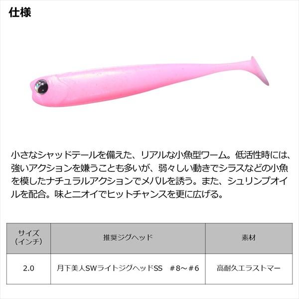 小さなシャッドテールを備えた、リアルな小魚型ワーム!低活性時には、強いアクションを嫌うことも多いが、弱々しい動きでシラスなどの小魚を模したナチュラルアクションでメバルを誘う。また、シュリンプオイルを配合しており、味とニオイでヒットチャンスを更に広げる。 サイズ:2.0インチ 推奨ジグヘッド:月下美人SWライトジグヘッドSS #8~#6 ※実物と色が違って見える場合があります。あらかじめご了承下さい。