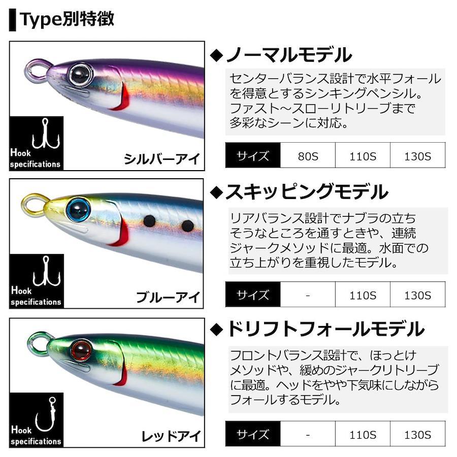 様々なシチュエーションに合わせて対応可能な3種類。水平フォールを得意とするオーバーゼア。スキッピングメソッド対応、リアウエイト仕様のスキッピング。ほっとけメソッドなど水中でのフォール姿勢にこだわったフロントウエイト仕様のドリフトフォール。それぞれのシーンに合わせて対応可能です。ホログラムには魚肌をリアルに再現したアデルホログラムを採用。