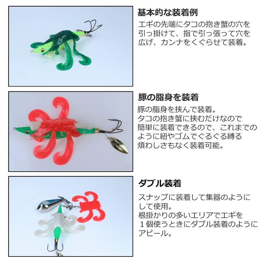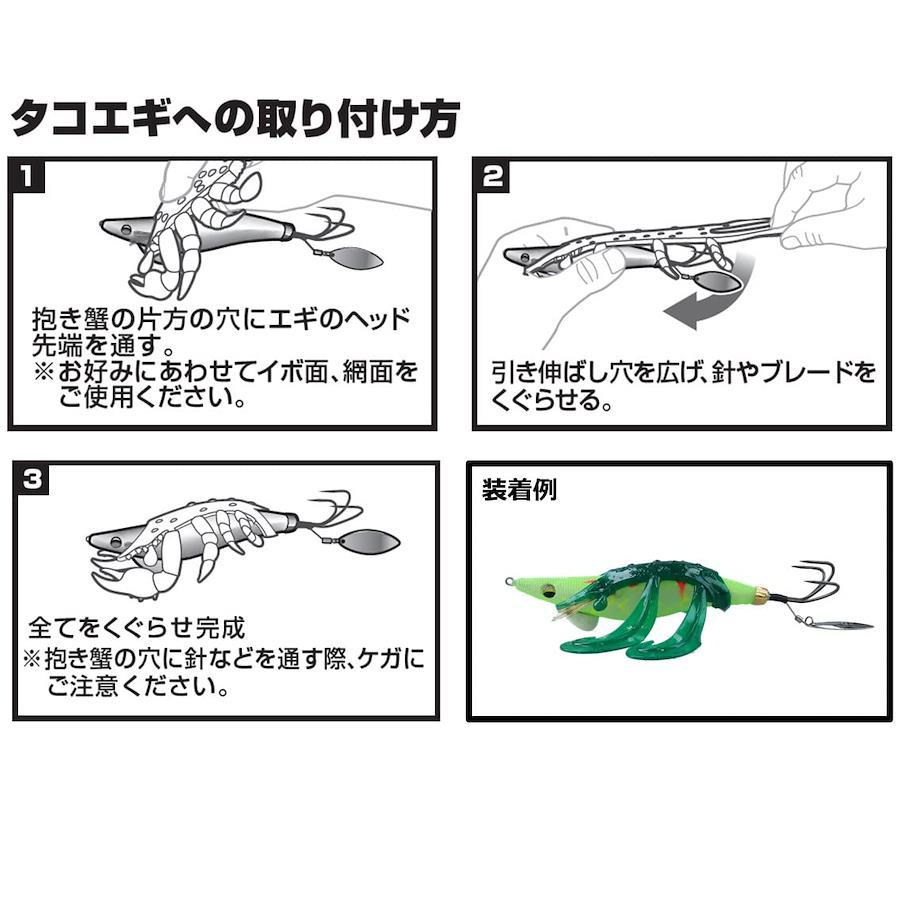 タコエギに装着するワーム。蟹のシルエットとクローアームで誘い、柔らかい抱き心地と強い匂いで抱かせます!タコエギをタコの大好きな蟹シルエットにチューニング。 穴にエギを引っ掛けるだけの簡単装着。揺れる船上でも快適に使用可能!アミノX+甲殻類パウダーを最大限配合 匂いでアピール! 2.5~4号のDAIWA、DAIWA以外の多くのエギに装着可能。豚の脂身、サバの切り身などのエサホルダーとしても使用可能。【免責事項】※メーカーのリニューアルに伴い仕様・カラー等が予告無く変更になる場合がございます。新パッケージでお届け致します事ご了承願います。
