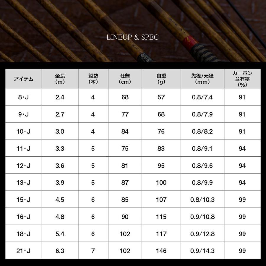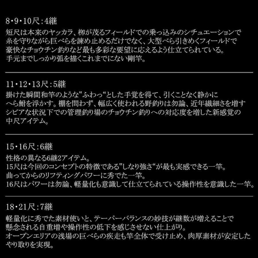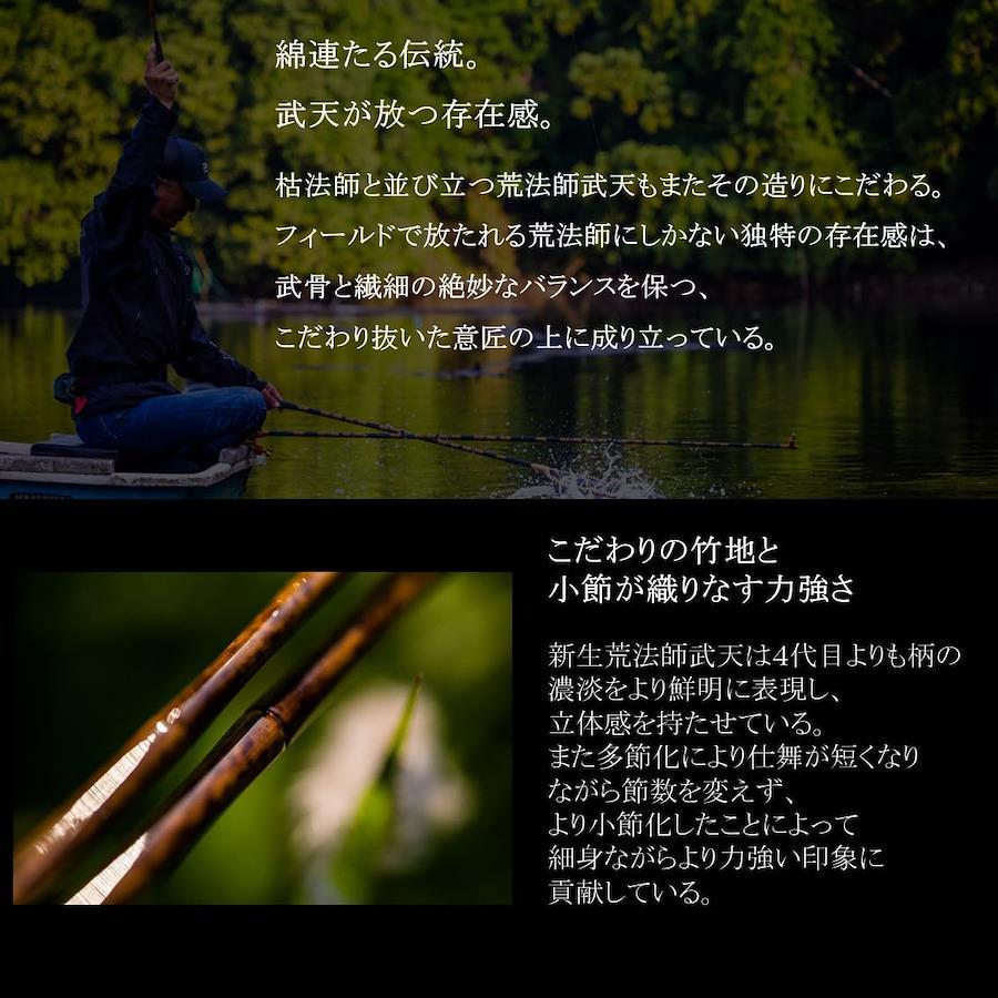 「荒法師・武天」。その名は誕生以来、強さが身上の「剛竿」として普く認知されてきた。 しかし、へらぶな釣りの変遷とテクノロジーの進化がこの竿の有り様を変えて来たのも歴史的必然。 パワーロッドとしての軸は継承しつつ、「硬さで巨べらをねじ伏せる」竿から、「曲がりで巨べらをいなし獲る」竿へと変貌を遂げた。 この「しなやかなる剛竿」は今回新たに「多節・細身肉厚」という意表を衝いた生地組みを得たことで、振り調子はしなやかながら、掛けるとどこまでも「タメ」が利く圧巻の粘り腰を見せる異次元の逸物へと昇華した。五代目「荒法師・武天」は我々に“その先の粘り腰”の世界という新たなるパワーゲームの頂を示してくれる。