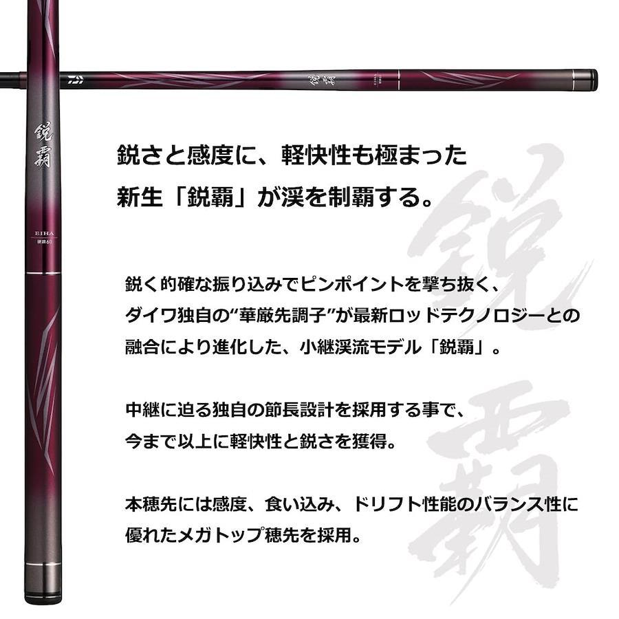 中継に迫る独自の節長設計を採用する事で、今まで以上に軽快性と鋭さを獲得。本穂先には感度、食い込み、ドリフト性能のバランス性に優れたメガトップ穂先を採用。また、標準付属の替穂先にはパワータイプの超弾性チタン合金穂先 採用し、カーボン素材では捉える事が困難な、目印に出ないような微かなアタリも手元にしっかりと伝達する。鋭さと感度に、軽快性も極まった新生「鋭覇」が、渓を制覇する。