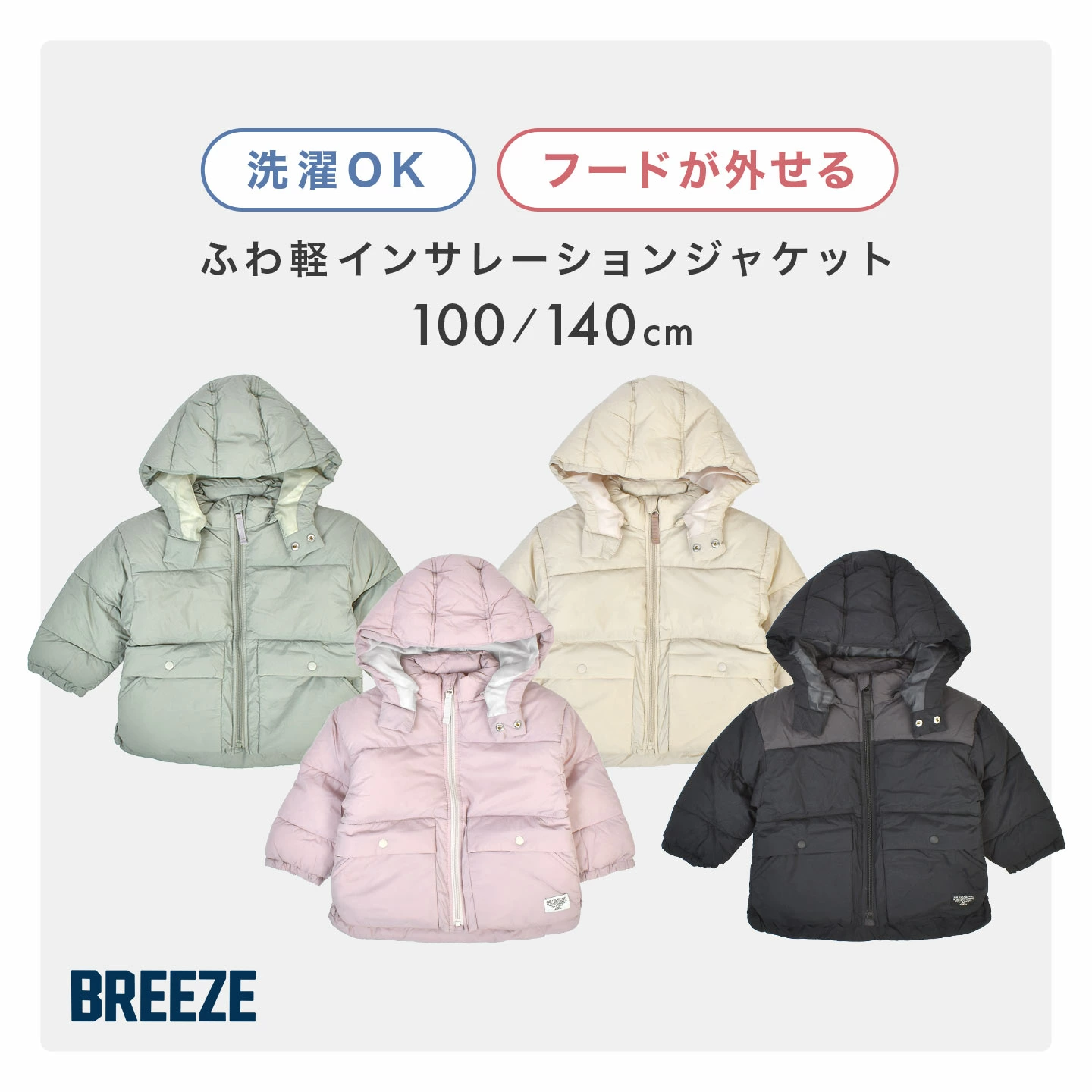 【ふわ軽インサレーションジャケット】ふわふわ軽い中綿で、柔らかくあたたかい♪BREEZEの大人気アウター「ふわ軽インサレーションジャケット」。着丈長めでしっかり防寒し、前立て付きで雨風もブロック!取り外し可能なフードでシーンに合わせた着こなしが楽しめます。マシンウォッシャブルなのでお手入れが簡単なのも嬉しいポイント♪デザイン性と機能性を兼ね備えた、頼れる冬の定番ジャケットです
