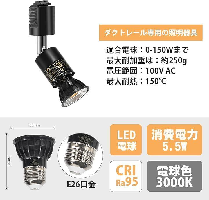1、電球付き:5.5W E26 LED電球(3個)+ダクトレール用器具(3個)、5.5W(60W 相当)、全光束550lm、ビーム角度 90°、明るさの演色性Ra95、電球色3000K照明 おしゃれ 照明器具。