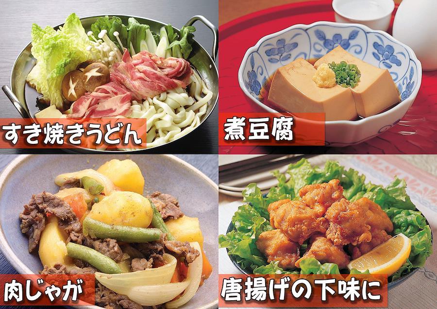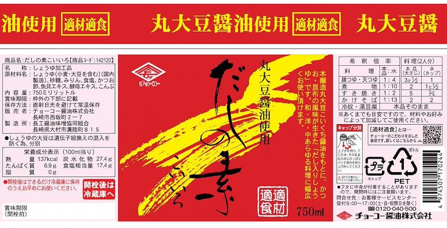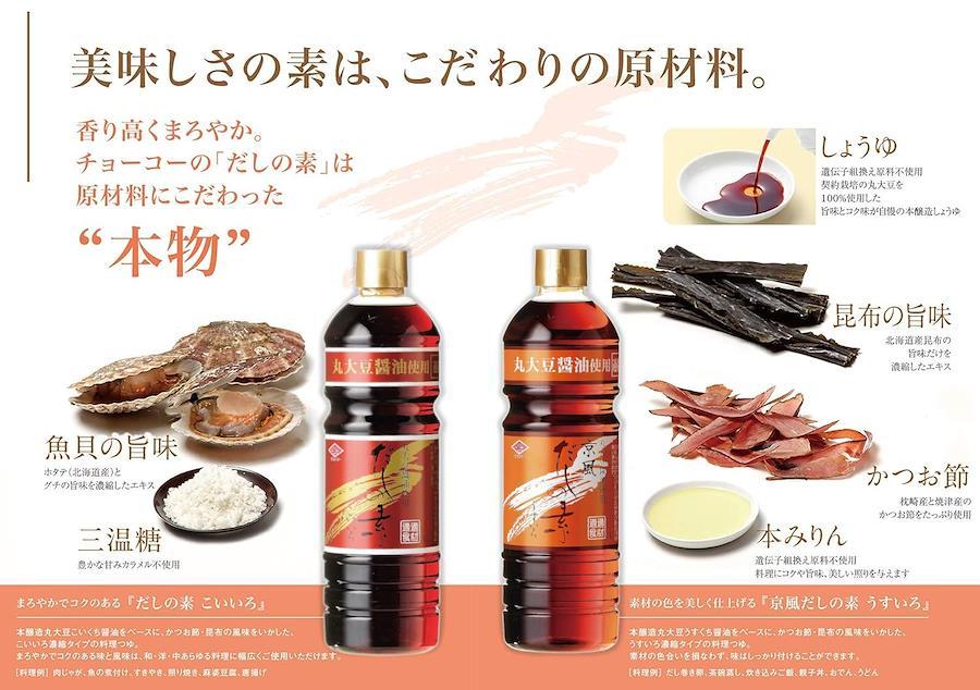 本醸造丸大豆こいくち醤油をもとに、かつお・昆布の風味が生きた「だし入りしょうゆ」です。 だしをとる手間がいらず、丸大豆醤油・かつおぶし・こんぶの三味が、まろやかでコクのある上品な香味をつくりあげます。 和・洋・中あらゆる料理に幅広くご使用いただけます。 使用方法 ●麺つゆ・天つゆ…本品1 : 水4 ●煮物…本品1 : 水10 ●すき焼き…本品1 : 水2 ●かけそば…本品1 : 水13 ●冷奴・湯豆腐…本品そのまま ※あくまでも目安ですので、材料やお好みによって加減してご使用ください。