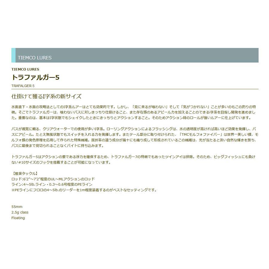 仕掛けて獲るI字系の新サイズ水面直下・水面の攻略法としてのI字系ルアーはとても効果的です。しかし、「見に来るが喰わない」そして「気がつかれない」ことが多いのもこの釣りの特徴。そこでトラファルガーは、喰わないバスに対しきっちり仕掛けること、また存在感のあるアピール力を加えることのできるi字系を目指し開発を進めました。重要なのは、基本はI字状態でもシェイクしたときにきっちりとアクションすること。そのためアクション時のロールが強いルアーに仕上げています。バスが視覚に頼る、クリアウォーターでの使用が多いI字系。ローリングアクションによるフラッシングは、水の透明度が高ければ高いほど効果を発揮し、バスにアピール。たとえ無風状態でもスイッチを入れる力を発揮します。またテール部分に取り付けられた、「TMCモルフォファイバー」は世界一美しい蝶、モルフォ蝶の発色原理を応用して作られた特殊繊維。屈折率の違う成分が幾十にも織り成して形成されているこの繊維は、光が当たると淡い自然な輝きを放ち、バスに最後まで見切られることなくバイトに持ち込みます。トラファルガー5はアクションの要である浮