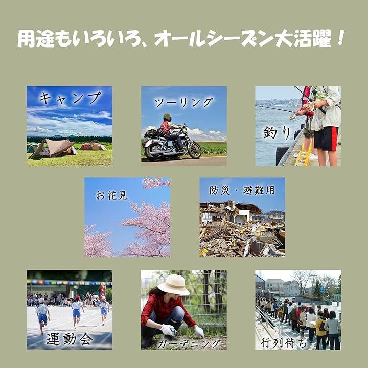 「様々なシーンで活躍」登山やキャンプ、釣り、アウトドア、旅行やツーリング、運動会、BBQ、お花見、花火、イベントの行列待ち、農作業やガーデニング、避難所