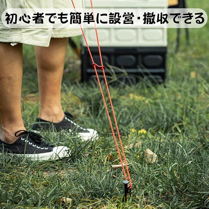 夜間でも視認性の高い反射材入りロープと、自在に長さ調節可能なアルミ自在金具を採用し、設営・撤収もスムーズ。