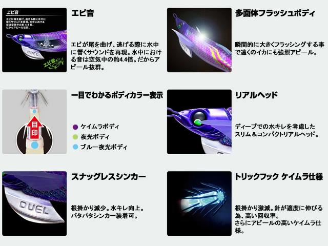 多面体フラッシュボディで遠くのアオリに高アピール!内部のラトルは、エビが尾を曲げ逃げる際に水中に響くサウンドを再現。ディープでの水キレを考慮した、スリム&コンパクトリアルヘッド。根掛かり激減のトリックフック。針が適度に伸びる為、高い回収率。さらにアピールの高いケイムラ仕様。