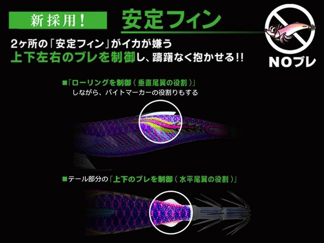2ヶ所の安定フィンが、イカが嫌う上下左右のブレを制御し躊躇なく抱かせる!