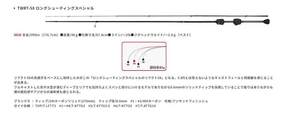 リアクト50の先調子をベースにし制作したのがこの「ロングシューティングスペシャルのリアクト58」となる。5.8ftとは思えないようなキャストフィールと飛距離を感じることが出来る。フルキャストした先や大型が潜むディープエリアでも気持ちよくスパッと掛けにいけるモデルでありながら0.6mmのソリッドティップを採用していることで張りはありながらも潮の抵抗感やアジからの違和感も感じられる。ブランクス : ティップ/24tカーボンソリッド(276mm) ティップ径/0.6mm #1・#2/40tカーボン 仕様/アンサンドフィニッシュ。ガイド仕様 : TOP/T-LFTT3 #1~#4/T-KTTG3 #5/T-KTTG3.5 #6/T-KTTG5 #7/T-ATTG10。