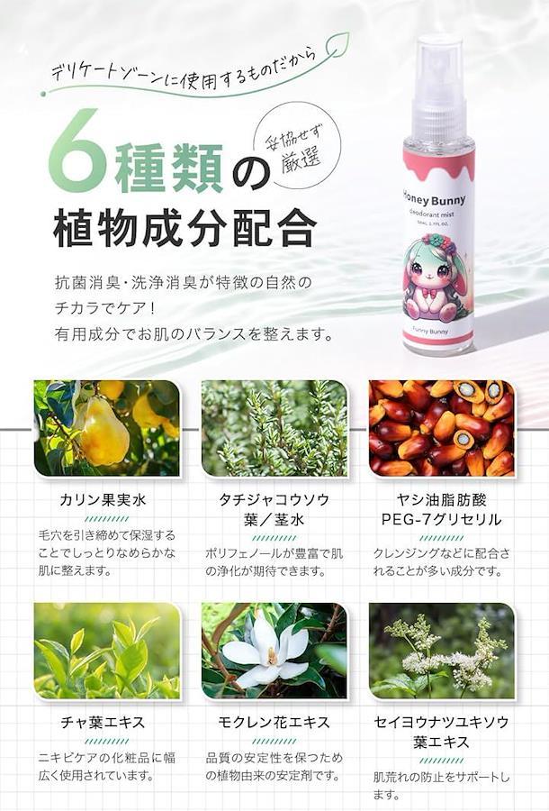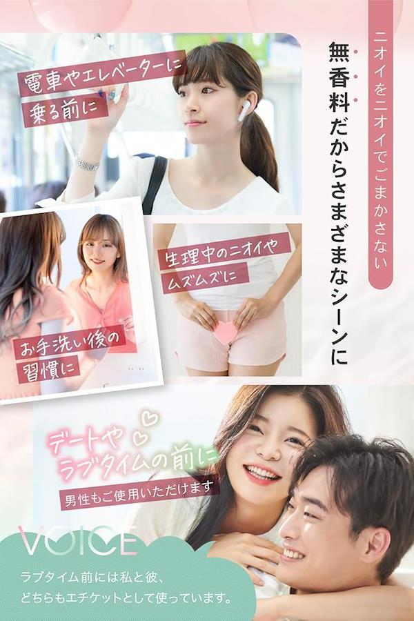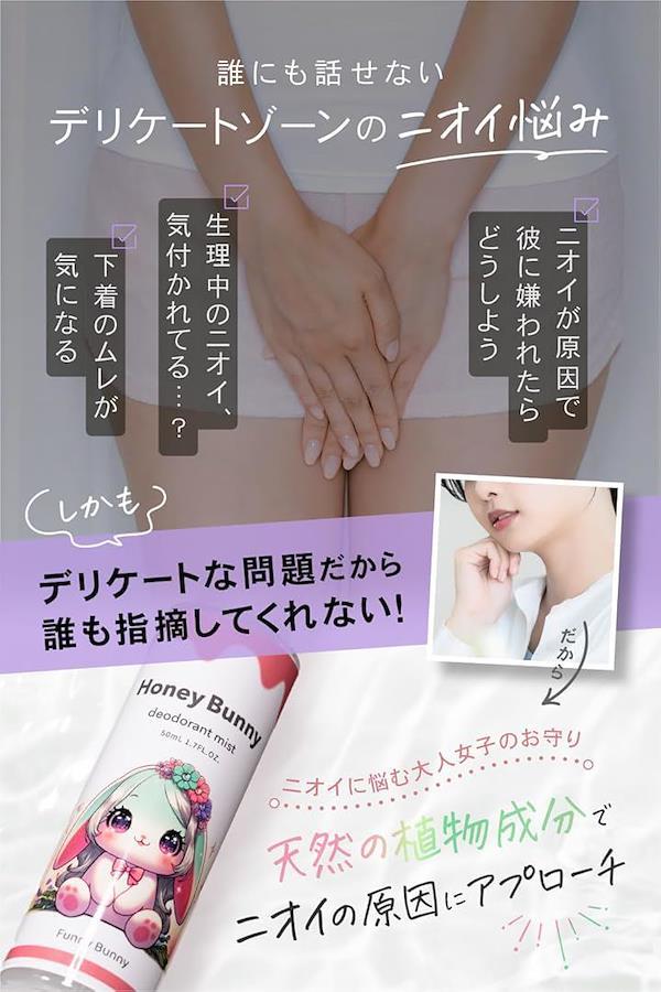 デリケートゾーンのムレ・ニオイにサヨナラ。自信あふれるあなたへ 「こんなお悩みありませんか?」 ・生理中のムレやニオイが気になる ・おりもののニオイが心配 ・デリケートゾーンのかゆみ、黒ずみ、乾燥が気になる ・市販のデオドラントだと刺激が強すぎる 「植物由来の成分で優しくケア」 カリンやモクレン、ソメイヨシノなど、厳選された植物エキスがデリケートゾーンを優しく包み込みます。