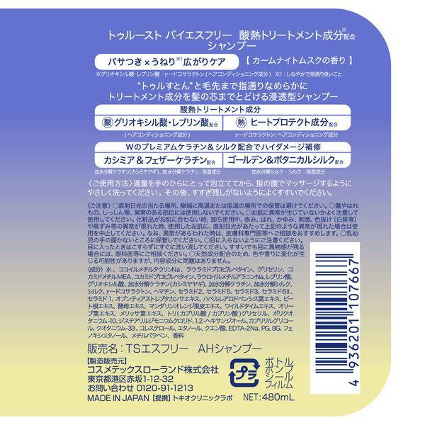 パサつき×うねり広がりケア。「トゥルすとん」と毛先まで指通りなめらかに。トリートメント成分を髪の芯までとどける浸透型シャンプー。●酸熱トリートメント成分配合。酸:グリオキシル酸・レブリン酸(ヘアコンディショニング成分)熱:ヒートプロテクト成分(γ-ドコサラクトン:ヘアコンディショニング成分)●Wのプレミアムケラチン(カシミア&フェザーケラチン)&シルク(ゴールデン&ボタニカルシルク)配合でハイダメージ補修。●カームナイトムスクの香り。