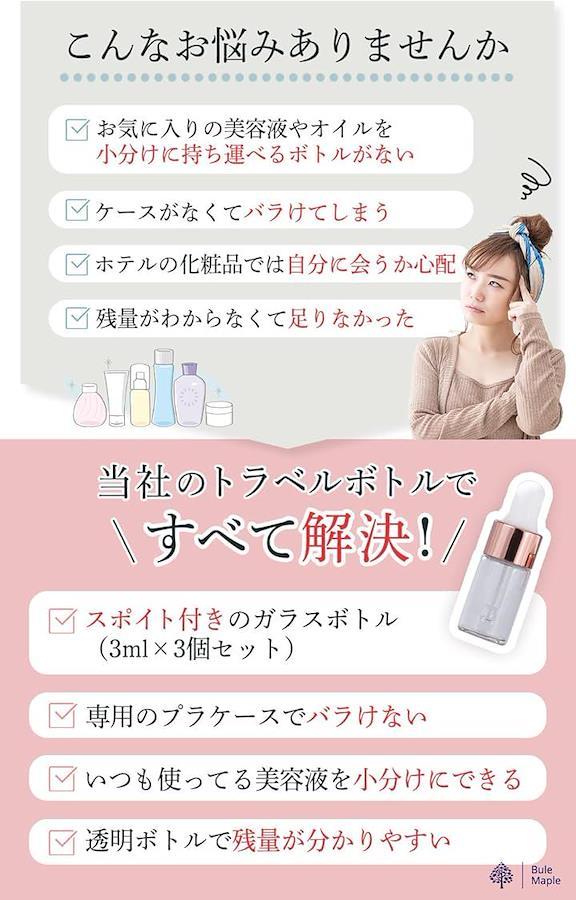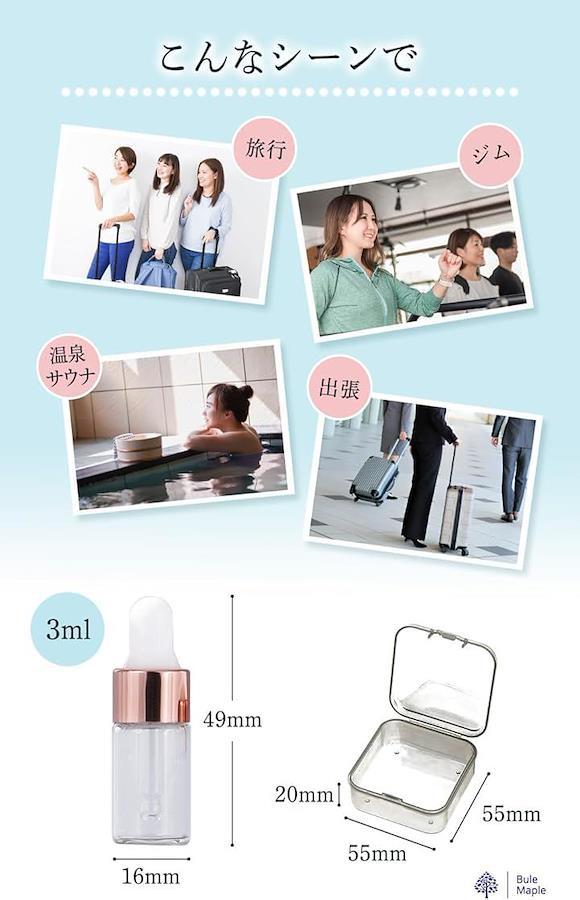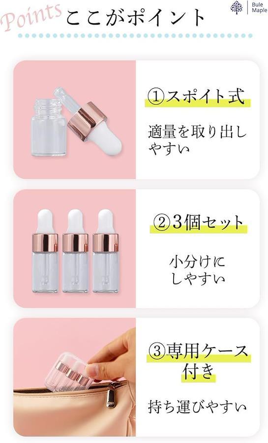 容量は3ミリリットルx3個で、専用ケース付きでバラけることなく実用的に持ち運びすることができ便利です。