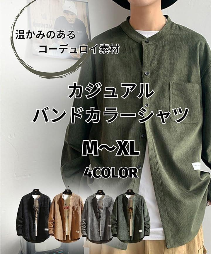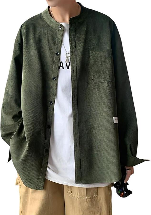 温かみのあるコーデュロイ素材と首元のバンドカラーで、季節感あふれるカジュアルコーデを演出してくれます。