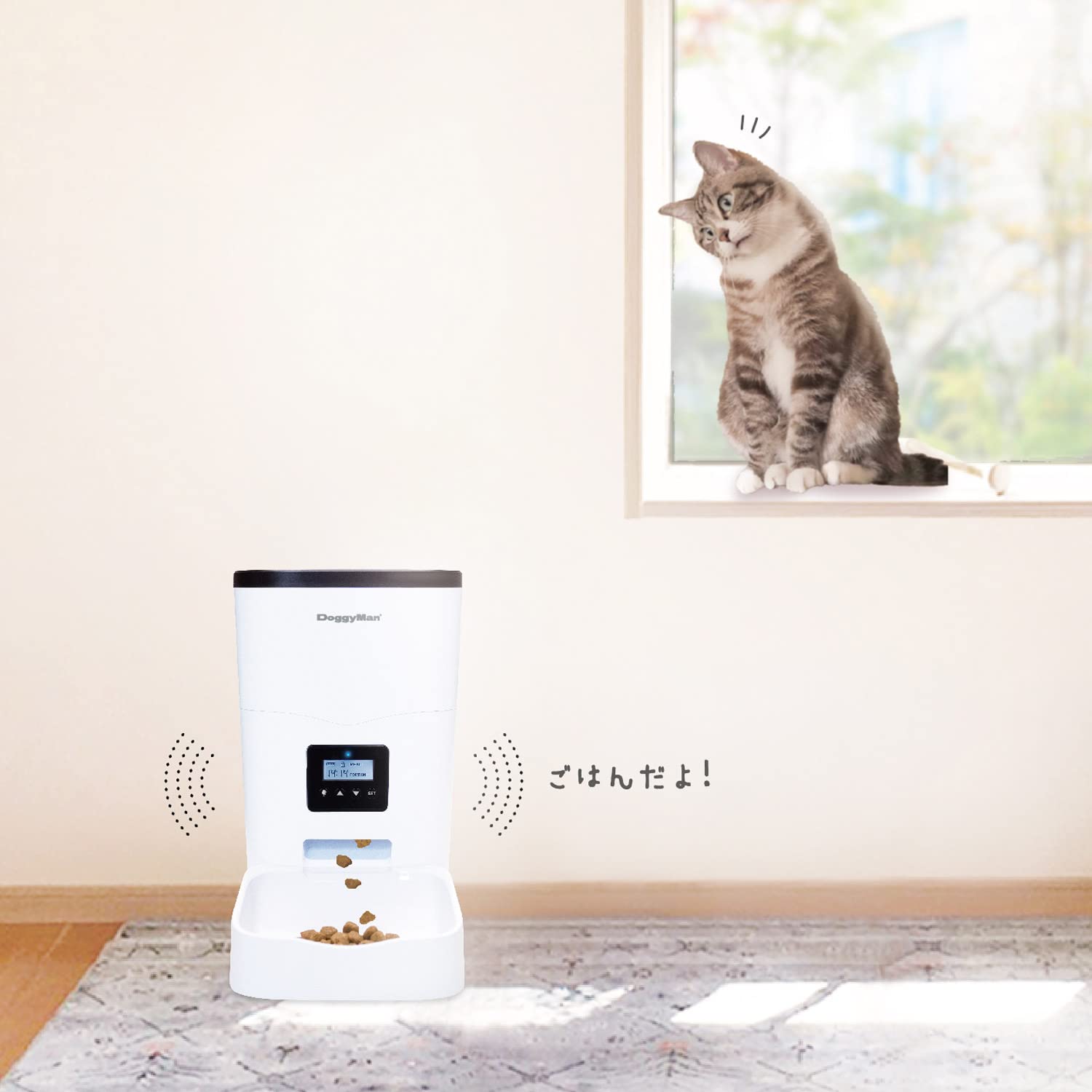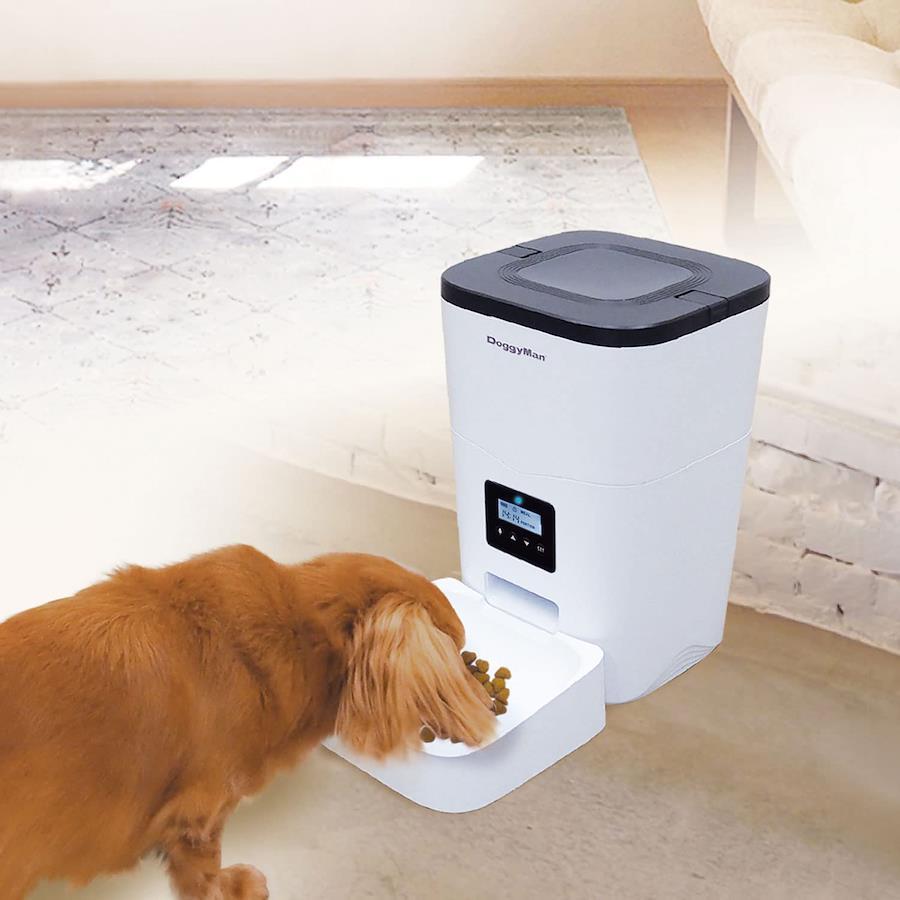 商品紹介 ●タンク容量約1kg(3L)のフードストッカーがついたドライフード専用自動食器/自動給餌機。●1日最大4回(食)の正確な時間に1食6~54g(6g単位)の正確な量を提供。●録音機能付。フードを提供するときに飼い主さんの声で合図することもできる。●停電時のリスク回避にもなる乾電池とUSBコードの2電源式。(乾電池とUSB用アダプターは付属していません)●直径2~12mm、厚み12mm以下のフードに適合。ストッカー部のふたはカチッと閉まり、食器部は水洗いできる。 使用方法 取扱説明書の記載事項に従い、電源を入れ、フードを入れて、現在時刻を設定したのち、給餌回数、給餌時刻を設定したから使用する。