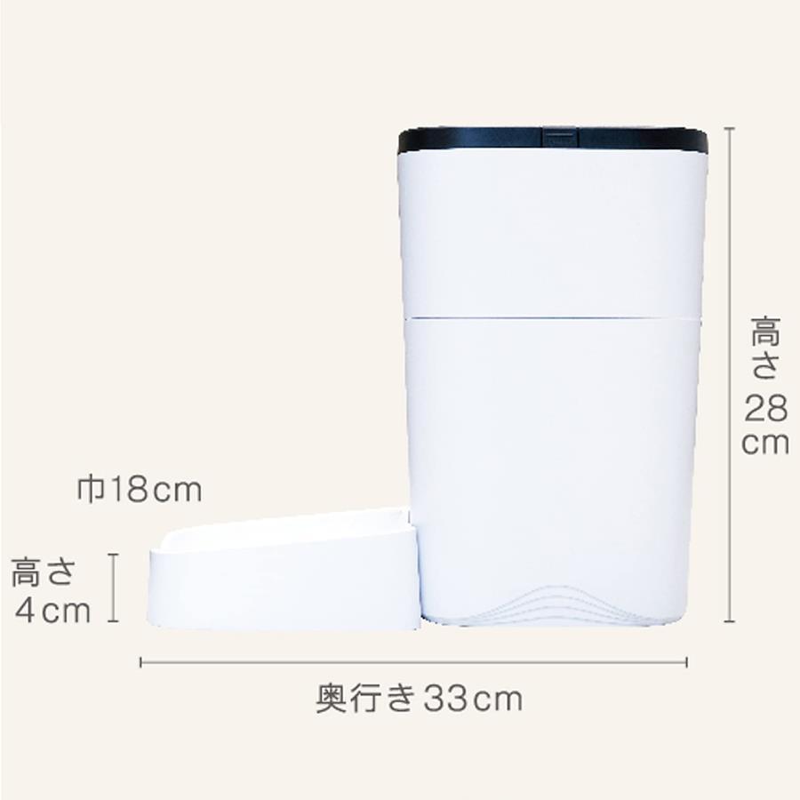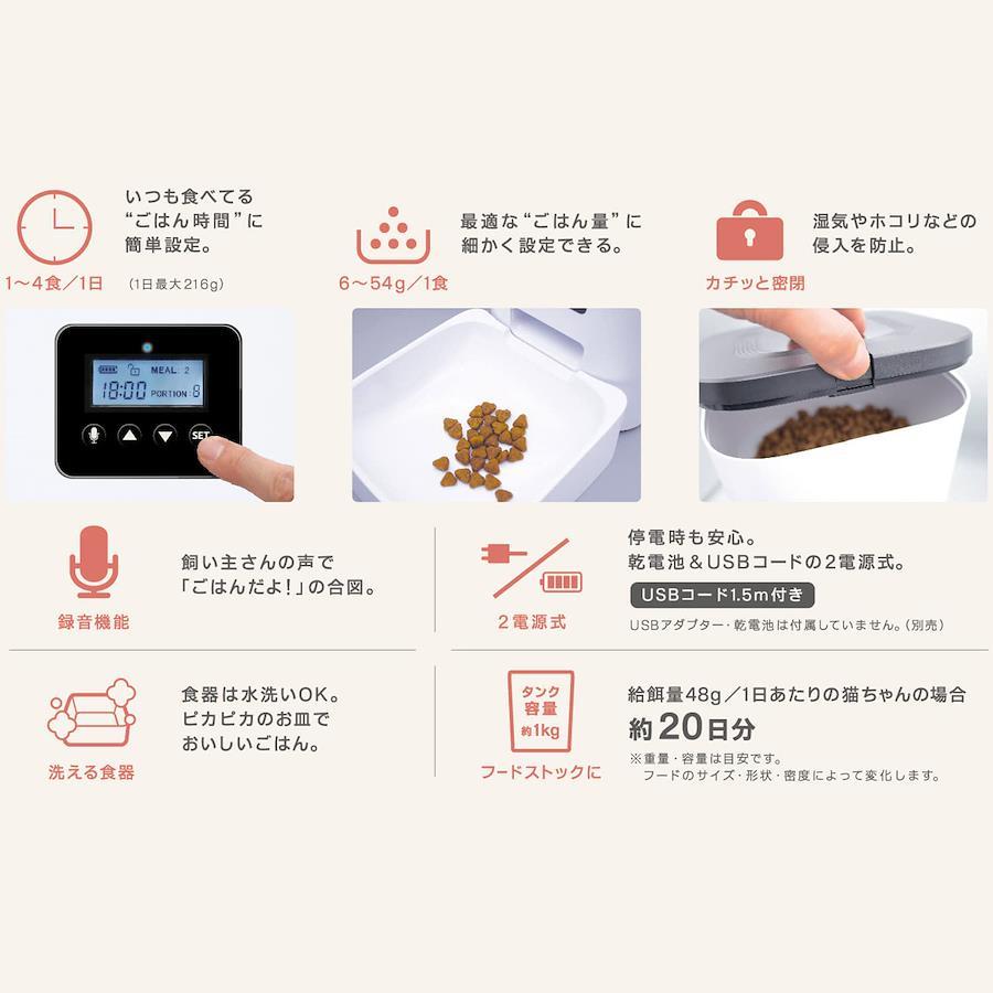 ●タンク容量約1kg(3L)のフードストッカーがついたドライフード専用自動食器/自動給餌機(犬・猫対象)。●1日最大4回(食)の正確な時間に1食6~54g(6g単位)の正確な量を提供。●録音機能付。フードを提供するときに飼い主さんの声で合図することもできる。●停電時のリスク回避にもなる乾電池とUSBコードの2電源式。(乾電池とUSB用アダプターは付属していません)●直径2~12mm、厚み12mm以下のフードに適合。ストッカー部のふたはカチッと閉まり、食器部は水洗いできる。