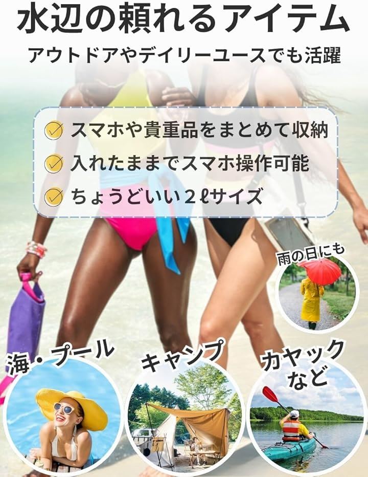 防水ポーチとしてだけでなく、砂や泥の侵入も防いでくれるため、キャンプ場や水辺のレジャーでも安心して使用できます。