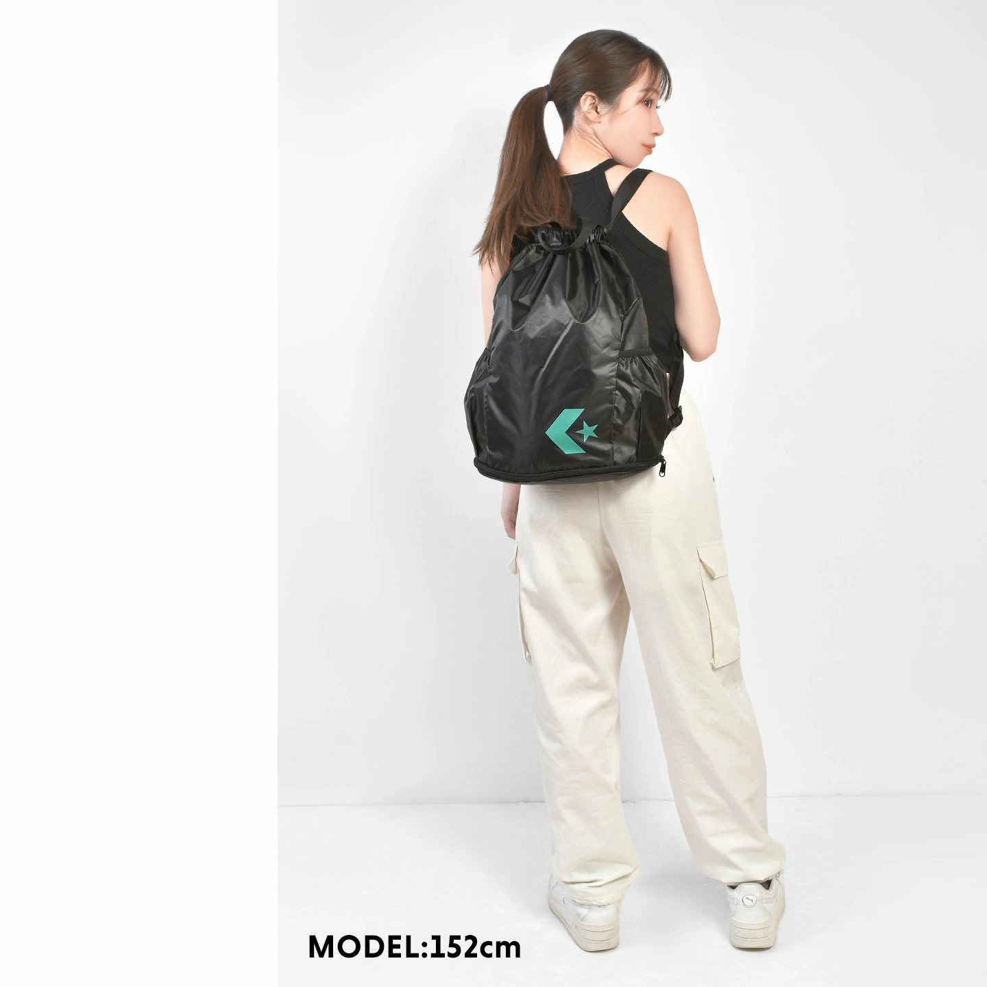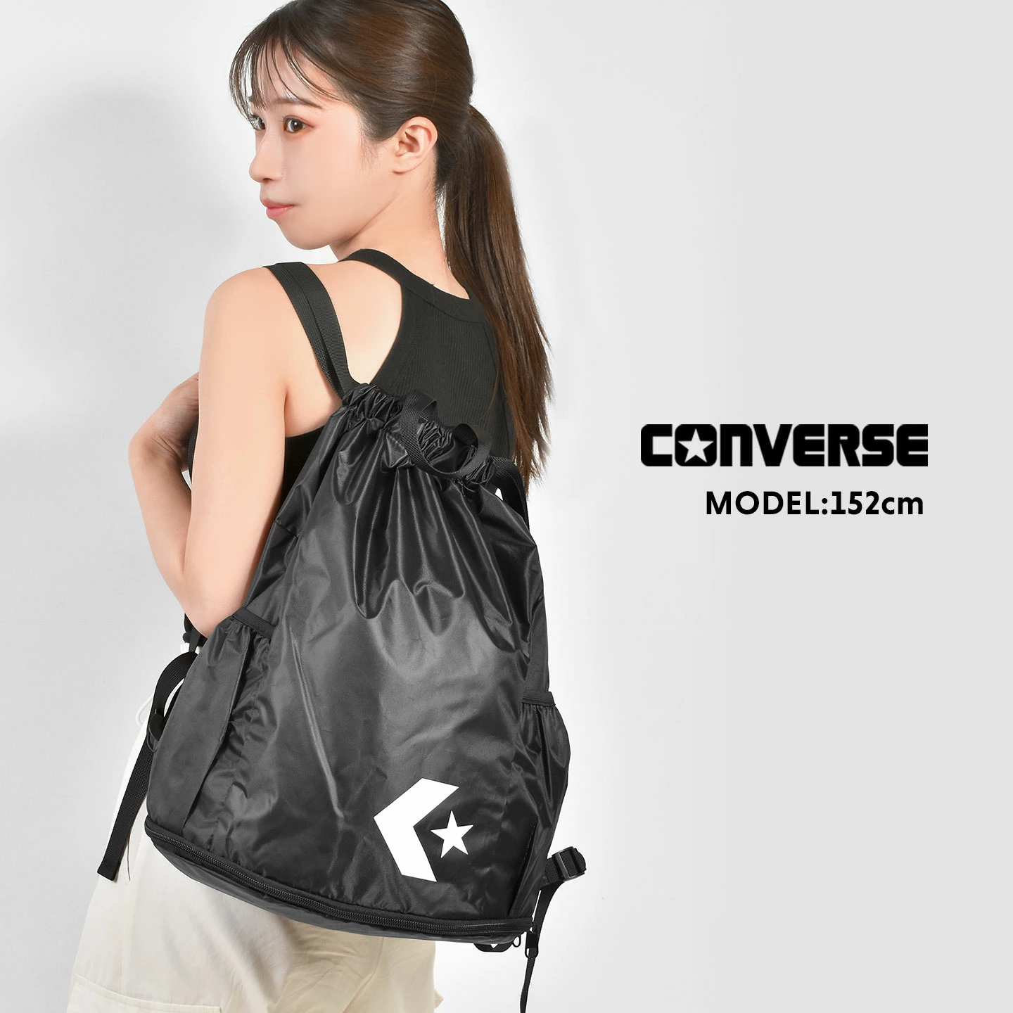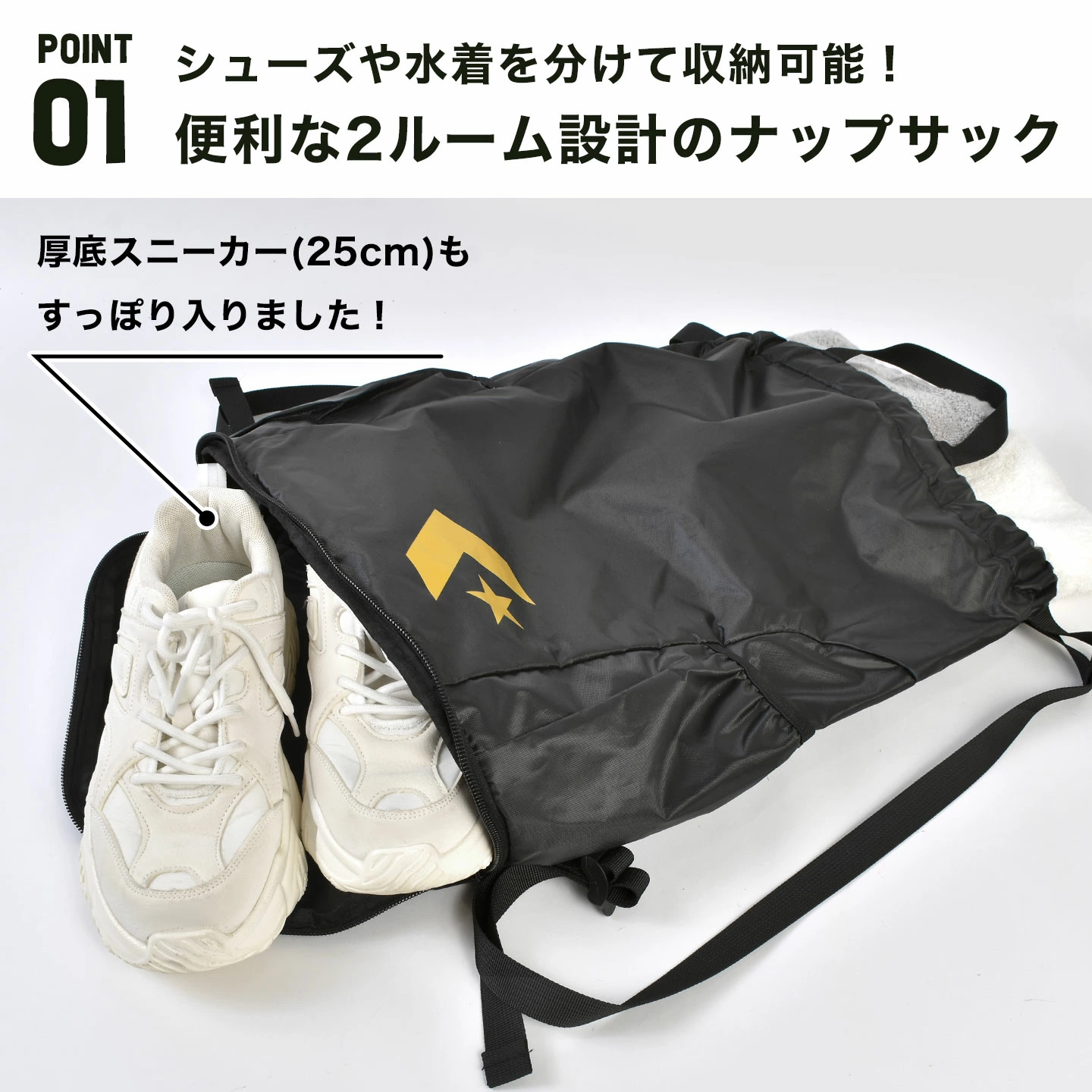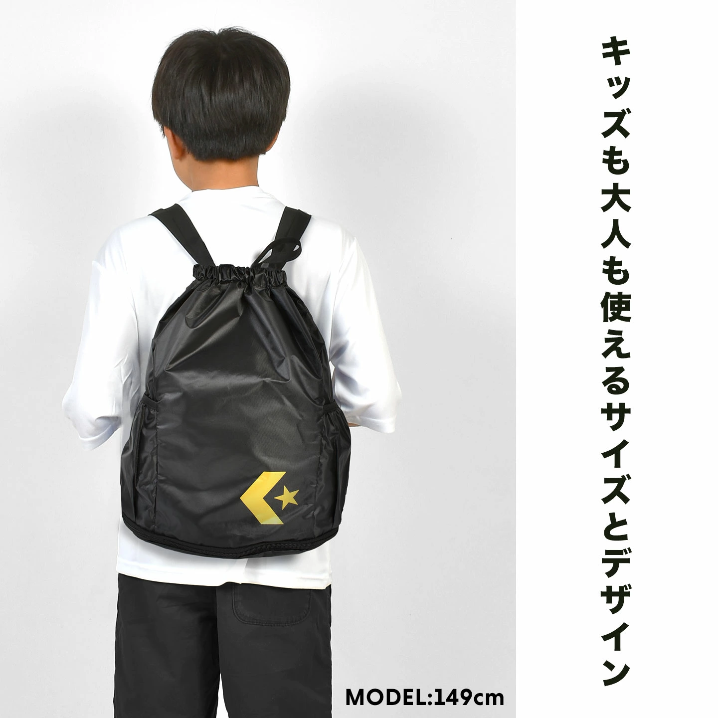 【2ルームナップサック】軽量かつ大容量!靴や濡れた水着などを分けて収納できる2ルーム仕様のナップサック。バスケットボールやバッシュなどのかさばるスポーツアイテムもしっかり収納でき、高耐水圧・撥水加工の生地は海やプールや雨で濡れたり、汚れたものを入れたりしても大丈夫。ペットボトルや折り畳み傘が入るサイドポケットもついて、収納力抜群。お子様の部活や通学、塾などはもちろん、大人のジムバッグにも。シンプルなコンバースのロゴデザインで世代問わず使えるアイテムです。
