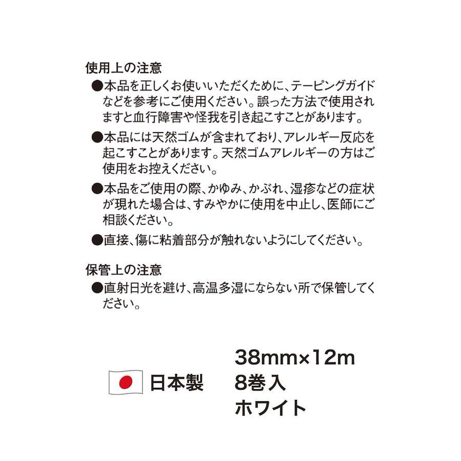 JAAF日本陸上競技連盟オフィシャルテープ柔軟な綿素材で動きによってテープのズレを最小限化軽い使用感でスピーディーに巻ける固定用テープ 幅:38mm 長さ:12m 入数:8巻入 部位:ひざ・肩用 基材:綿 粘着剤:天然ゴム系粘着剤 生産国:日本