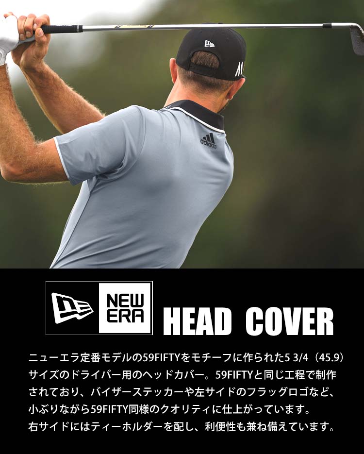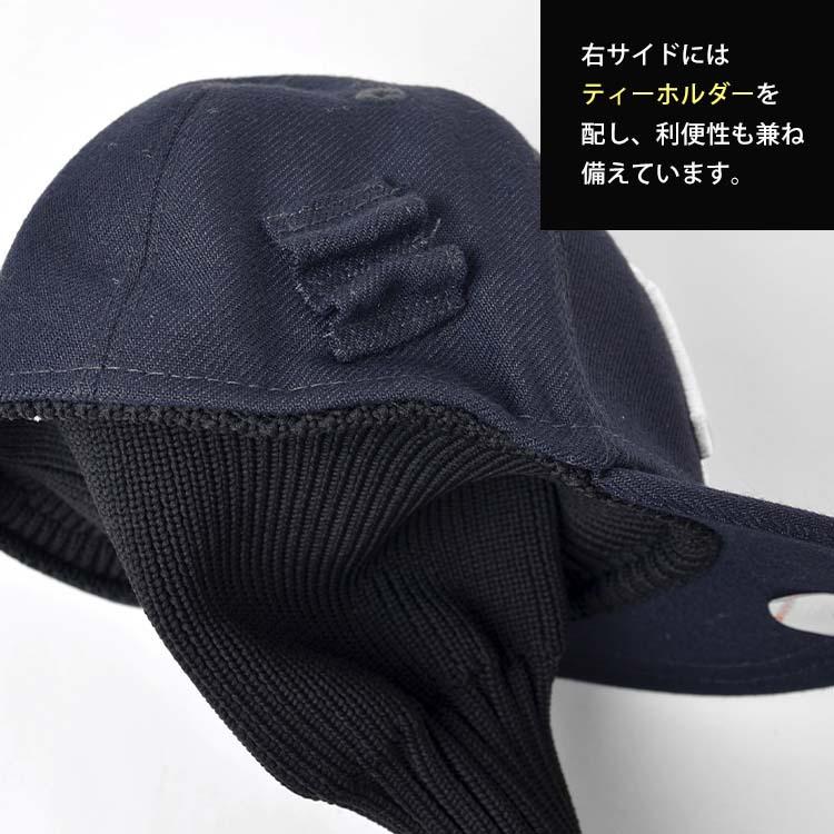【ヘッドカバー】ニューエラ定番モデルの59FIFTYをモチーフに作られた5 3/4(45.9)サイズのドライバー用のヘッドカバー。59FIFTYと同じ工程で制作されており、バイザーステッカーや左サイドのフラッグロゴなど、小ぶりながら59FIFTY同様のクオリティに仕上がっています。右サイドにはティーホルダーを配し、利便性も兼ね備えています。