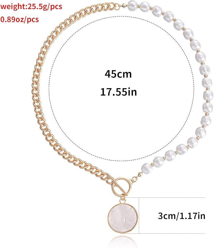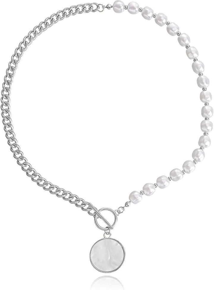 上品なフェイクパールと存在感のあるチェーンを組み合わせた、アシンメトリーデザインのネックレス。