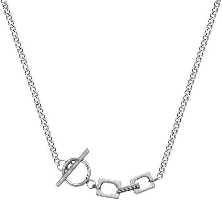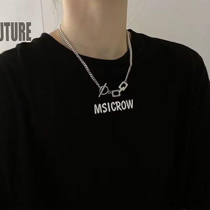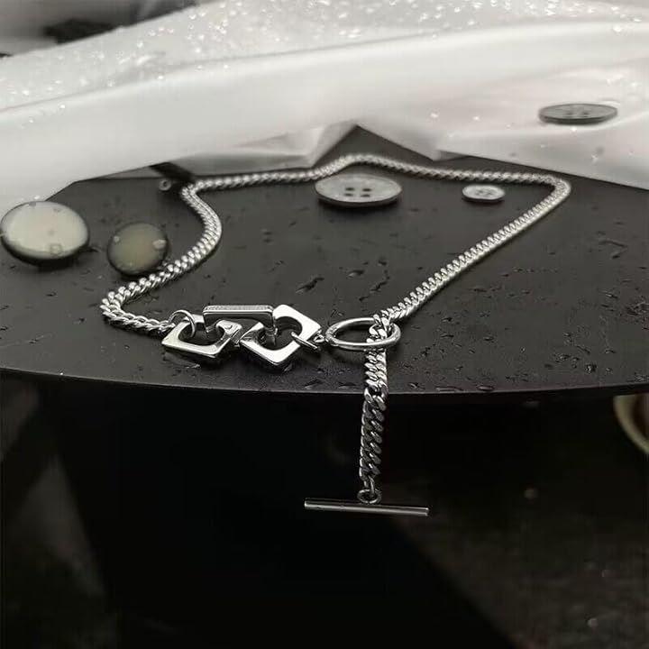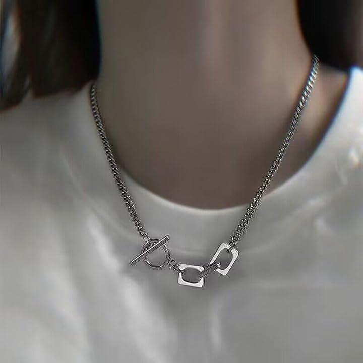 「前留めデザインがアクセントになる、個性派ネックレス」シンプルながら存在感を放つ、幾何学モチーフとOTフックを組み合わせたデザインネックレス。