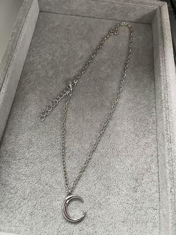 「サイズ/素材」ネックレス長:約40cm (+5cmのアジャスターチェーン付き) , 三日月部分:約1.5cm径 / 素材:合金