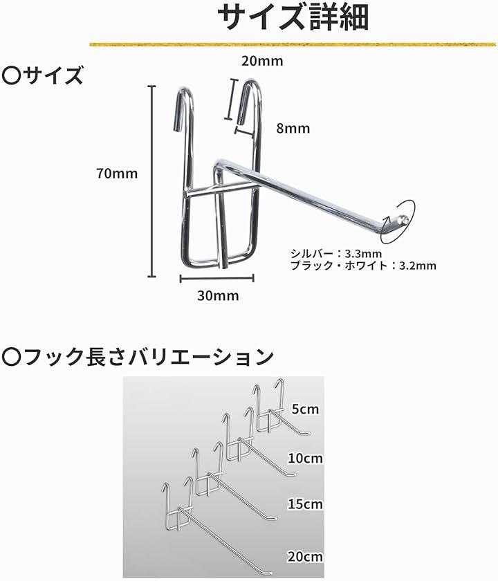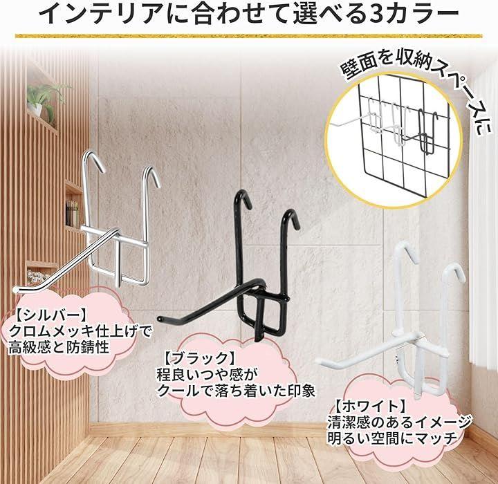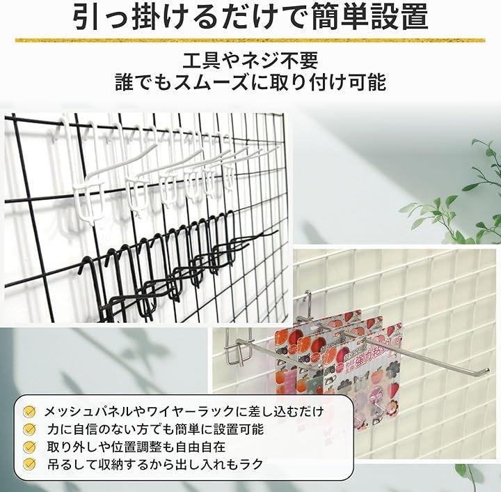 メッシュパネルやスチールラック、ワイヤーラックに引っ掛けるだけで使える汎用性の高い設計です。
