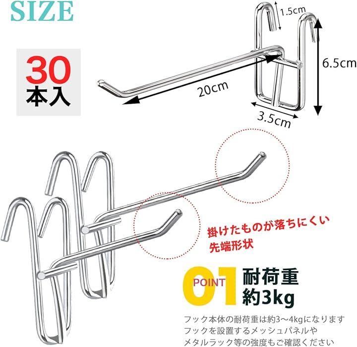 「商品内容」ネットフック:30本 サイズ(約):長さ20cm、縦6.5cm、横3.5cm、フック径3.4mm 耐荷重(約):3kg / 個 材質:鉄