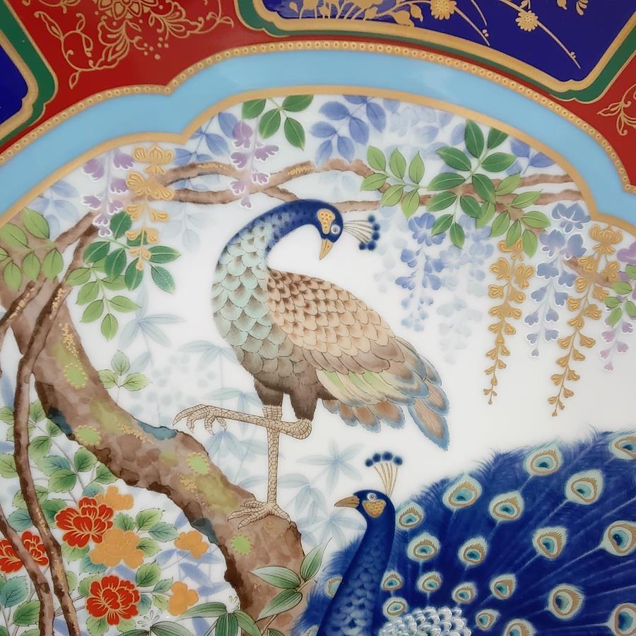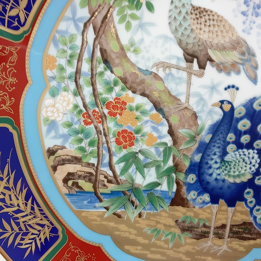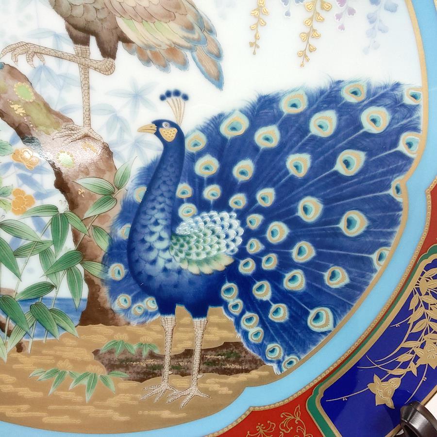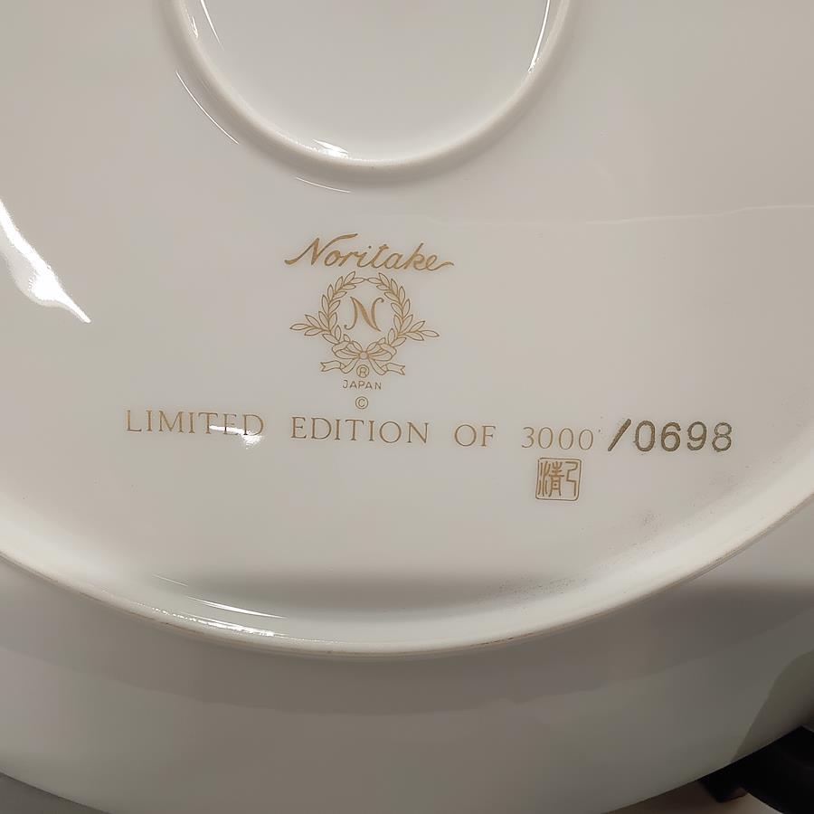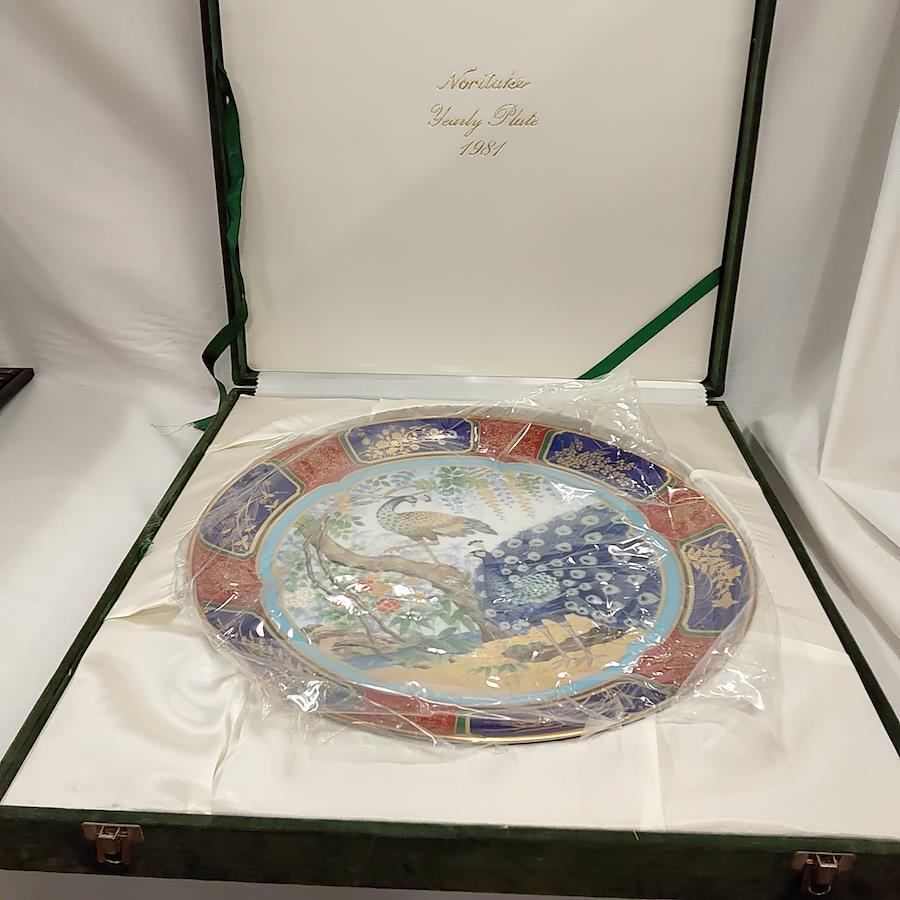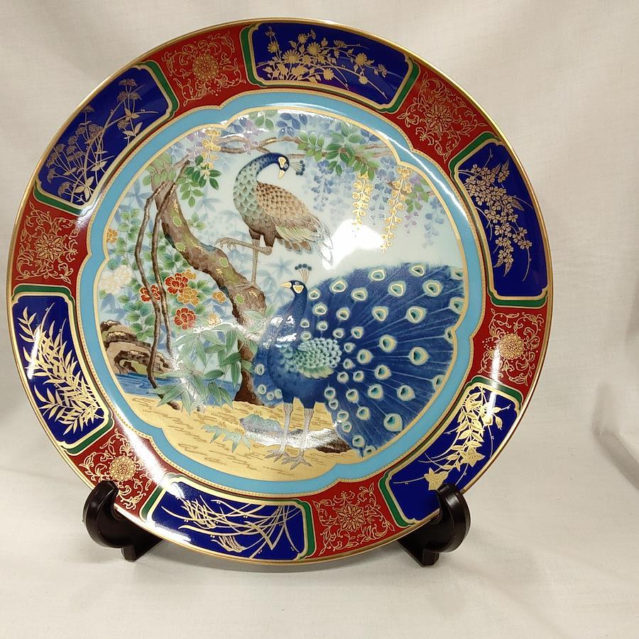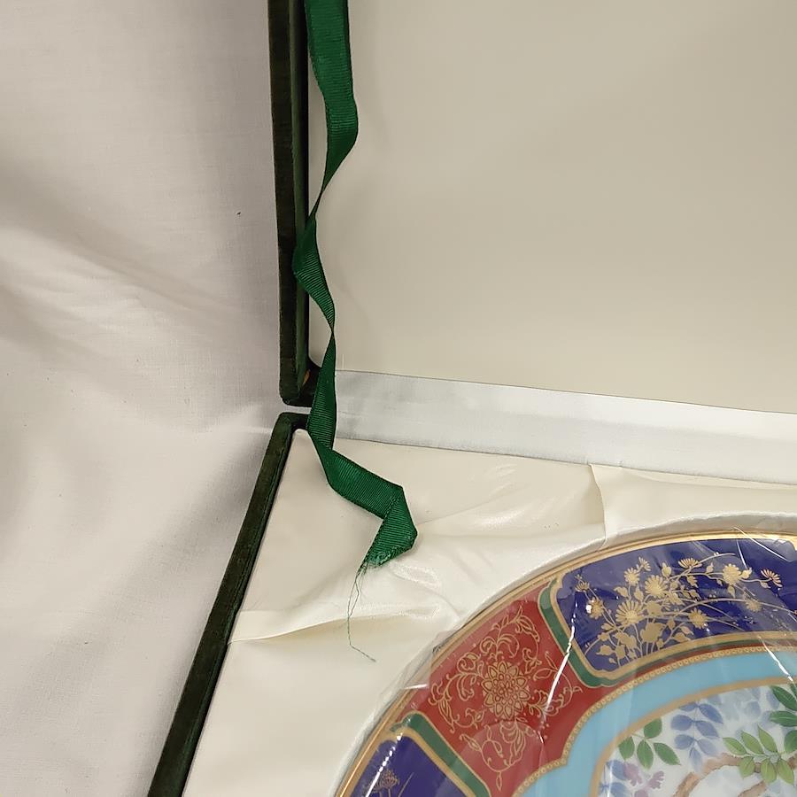 ノリタケ製の シリアルナンバー 入りの紀年額皿 です。直径35.5㎝の大皿に、美しい2羽のキジが描かれています。専用収納ケース付きですが長期保管のため経年劣化しています。(写真参照)