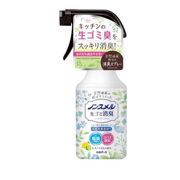 製品の特徴・キッチン周りでも使いやすい、天然由来成分*使用の消臭剤です。*有効成分、香料。・ゴミ箱や三角コーナー、排水口の気になる生ゴミ臭をすっきり消臭します。・ニオイの元となる菌を除菌。また菌の増殖を防ぐ効果でスプレーした後3~4日間、ニオイの発生を抑えます。(全ての菌に効果があるわけではありません。)・生ゴミの上に集まったコバエ*に直接スプレーして退治できます。*ショウジョウバエ・さわやかなレモンライムの香り。品名:芳香消臭・防臭剤用途:生ゴミ用