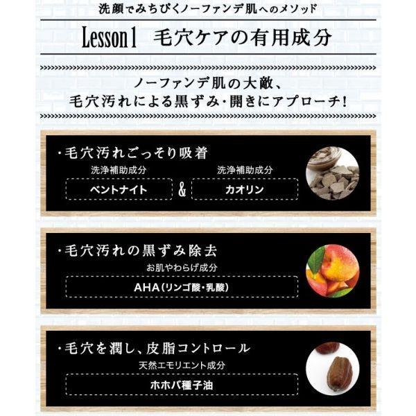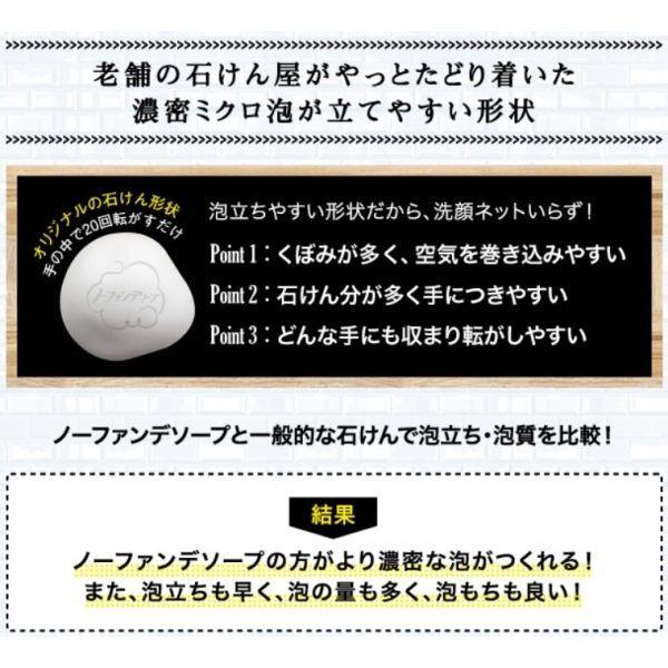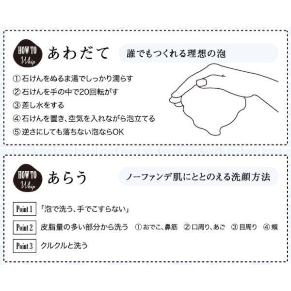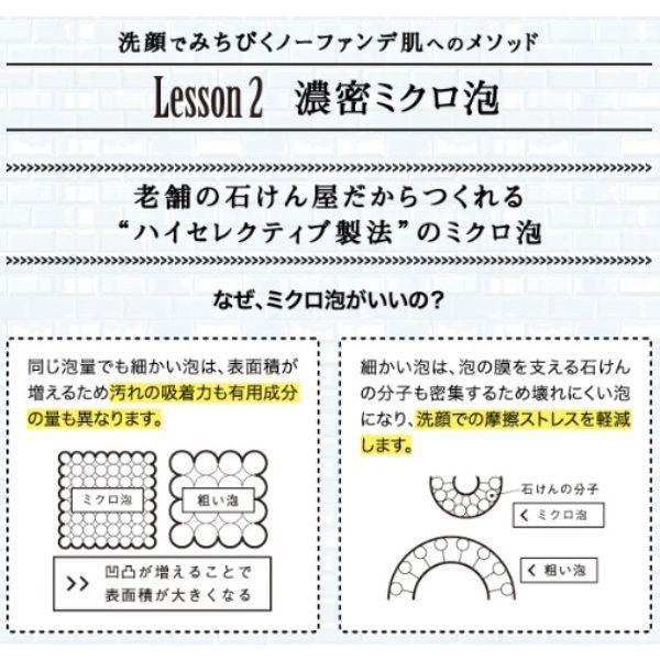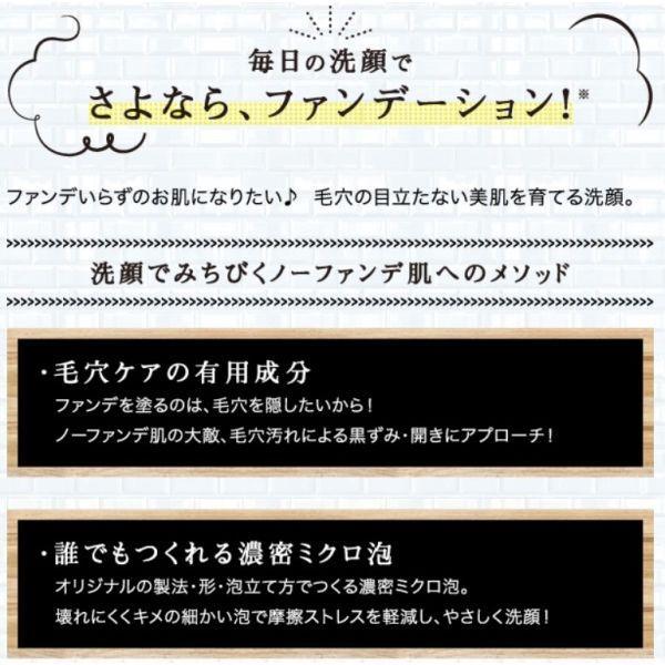ノーファンデ宣言。毛穴の目立たない美肌を育てる洗顔。●老舗の石けん屋がやっとたどり着いたオリジナル石けん形状。●洗顔でみちびくノーファンデ肌へのメソッド。(1)毛穴ケアの有用成分。・毛穴汚れごっそり吸着:ベントナイト&カリオン・毛穴汚れの黒ずみ除去:AHA、リンゴ酸、乳酸・毛穴を潤し、皮脂コントロール:ホホバ種子油※植物由来の洗浄成分を使用しています。(2)濃密ミクロ泡。老舗の石けん屋だからつくれる「ハイセレクティブ製法」のミクロ泡。●鉱物油、パラベン、エタノール、合成着色料、合成香料は使用していません。