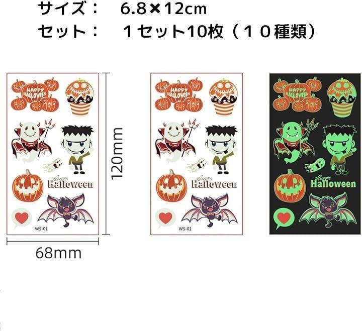 「お得セット、10枚入り」:10枚タトゥーシール;各枚サイズ:6.8cmx12cm;カボチャ・バンパイヤ・ドクロ・コウモリ・おばけなどの様々な図柄。
