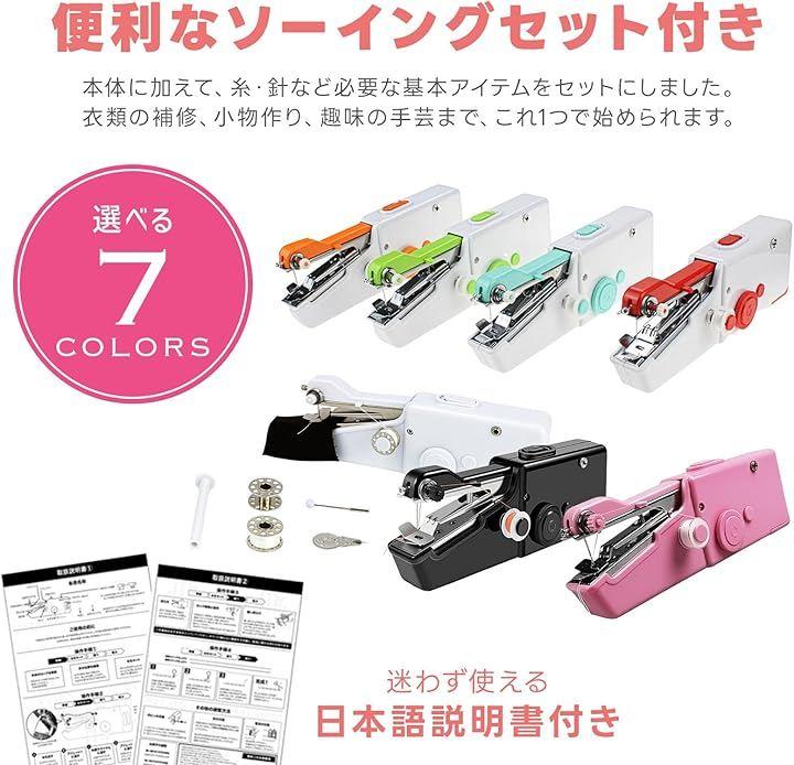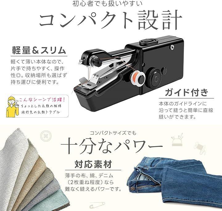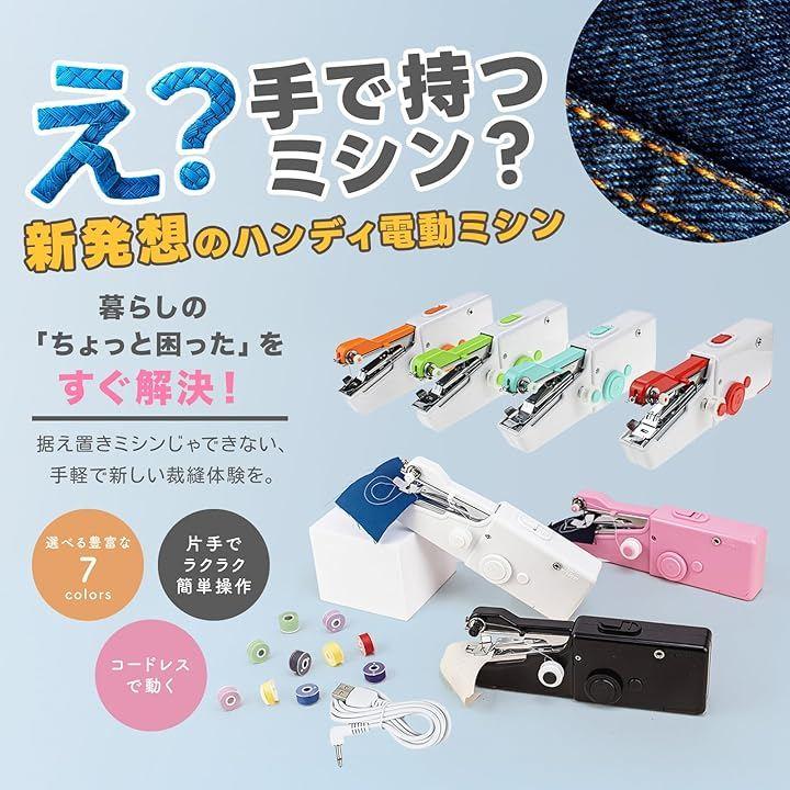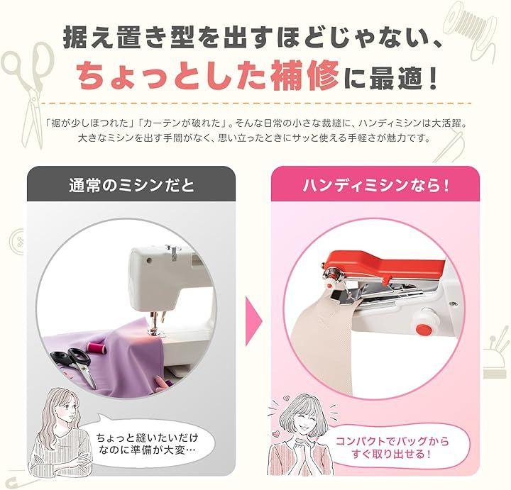 「手軽に使える電動ミニミシン」 ハンディミシンは、コンセント不要で片手操作が可能な電動タイプの小型ミシンです。