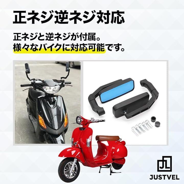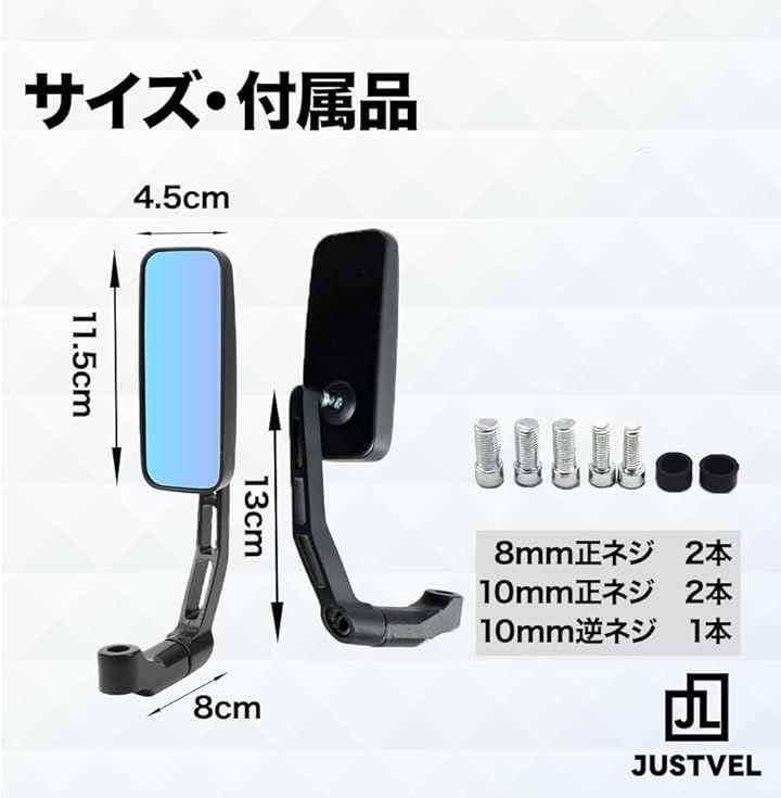 「商品仕様」ミラー本体左右:1セット 正ネジ:10mm 2本、8mm 2本 逆ネジ:10mm 1本 キャップ:2個